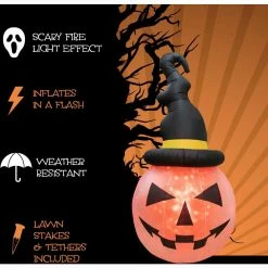 Your neighbors will be in for a fright they see your 10-ft. Inflatable Pumpkin with Black Hat and Fire Lights. This pre-lit inflatable is outfitted with two red internal LED lights to give it a fire light effect and will be the centerpiece of your own personal haunted house. At 10-ft. tall, it’s big enough to make the neighbors notice but still works in smaller yards or walkways. It’s the perfect trick to give your trick-or-treaters a scare without giving them nightmares. The treat is how quick and easy it is to set up with included ropes and lawn stakes for secure installation. Thanks to the internal lights and fan all you need to do is unpack it, plug it in, stake it down and you’re ready for some scary fun all Fall long. Created out of durable, weather resistant polyester, you won’t need to worry about holes. Your inflatable will last year after year and scare after scare. With Haunted Hill Farm, you’ll have everything you need to be voted the scariest house on the block!