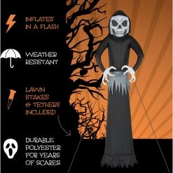 Your neighbors will be in for a fright they see your 12-ft. Inflatable Ghost with Lights. This pre-lit inflatable is outfitted with five white internal LED lights and will be the centerpiece of your own personal haunted house. At 12-ft. tall, it’s big enough to make the neighbors notice but still works in smaller yards or walkways. It’s the perfect trick to give your trick-or-treaters a scare without giving them nightmares. The treat is how quick and easy it is to set up with included ropes and lawn stakes for secure installation. Thanks to the internal lights and fan all you need to do is unpack it, plug it in, stake it down and you’re ready for some scary fun all Fall long. Created out of durable, weather resistant polyester, you won’t need to worry about holes. Your inflatable will last year after year and scare after scare. With Haunted Hill Farm, you’ll be the scariest house on the block!