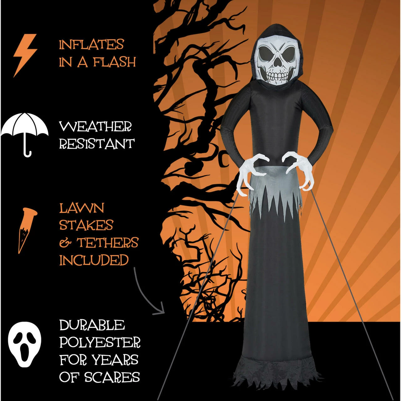 - Durable polyester is UV and weather resistant for use year after year and scare after scare