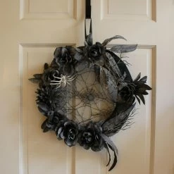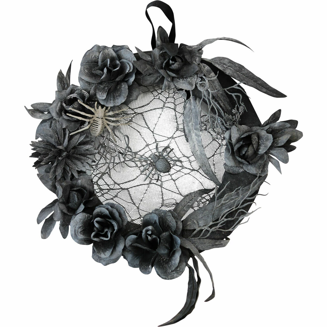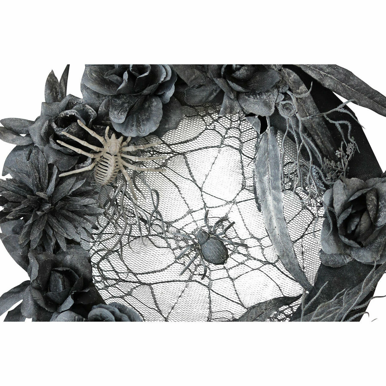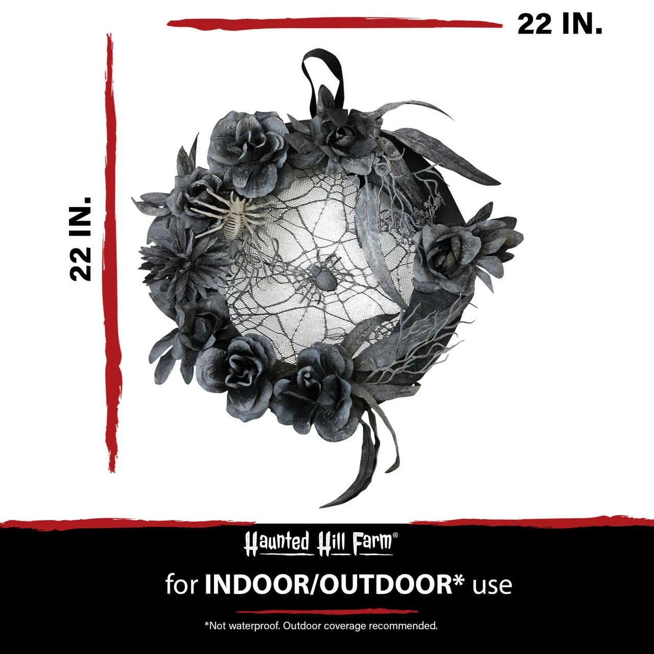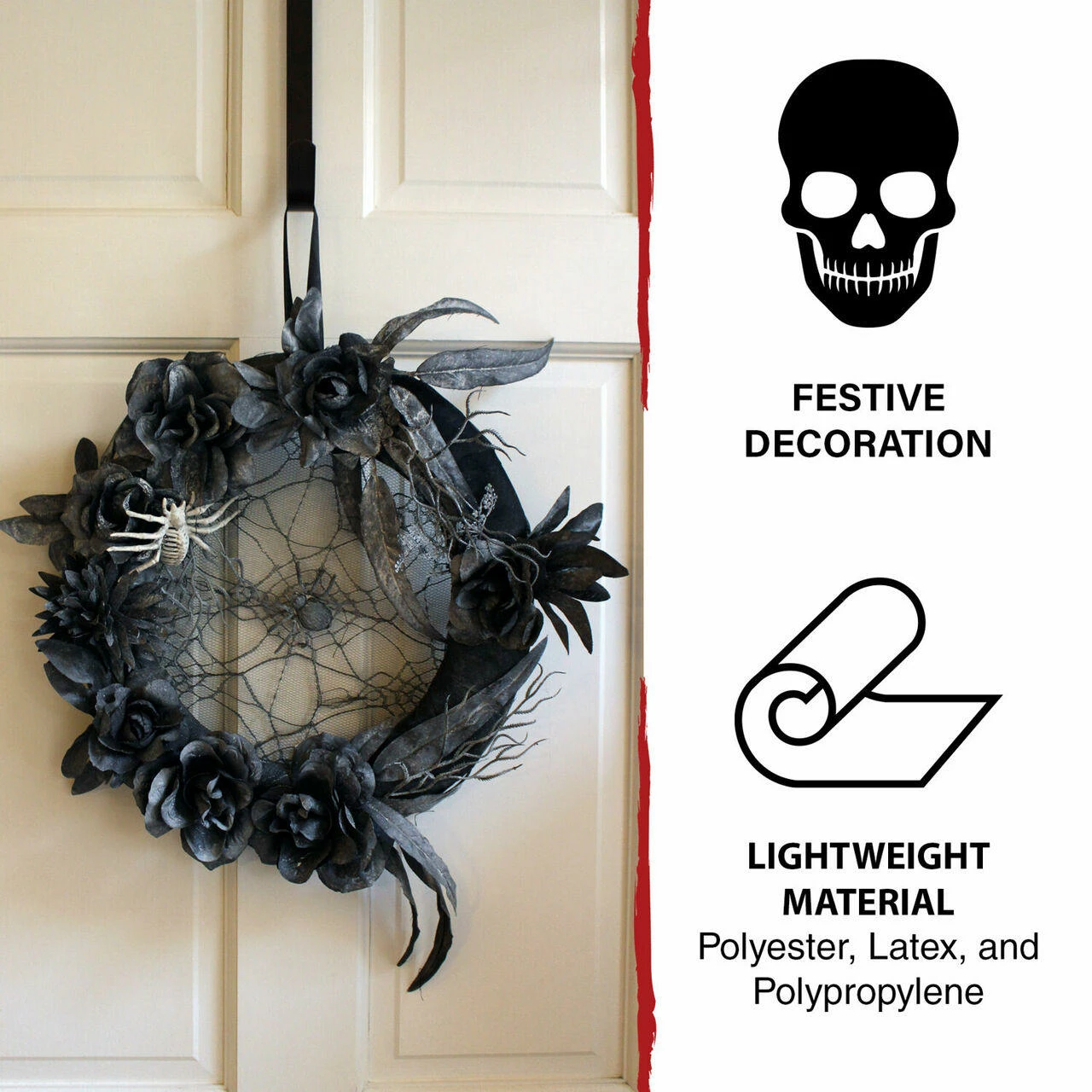 Be afraid! Be very afraid of the Haunted Decor Collection by Haunted Hill Farm. These blood-curdling decorations are sure to terrify any trick-or-treaters, co-workers, or customers. This Halloween wreath will add the perfect spooky touch to your holiday display. It will give your door an ominous, sinister vibe with black and gray flowers, leaves, and vines. Spider webs complete with spiders sit in the center of the wreath for an extra chilling essence. A larger spider with a skeleton body sits atop the wreath and exudes a creepy, crawly, living dead aura. Complete your home’s extra festive, fearsome flair with this dark holiday wreath from Haunted Hill Farm.