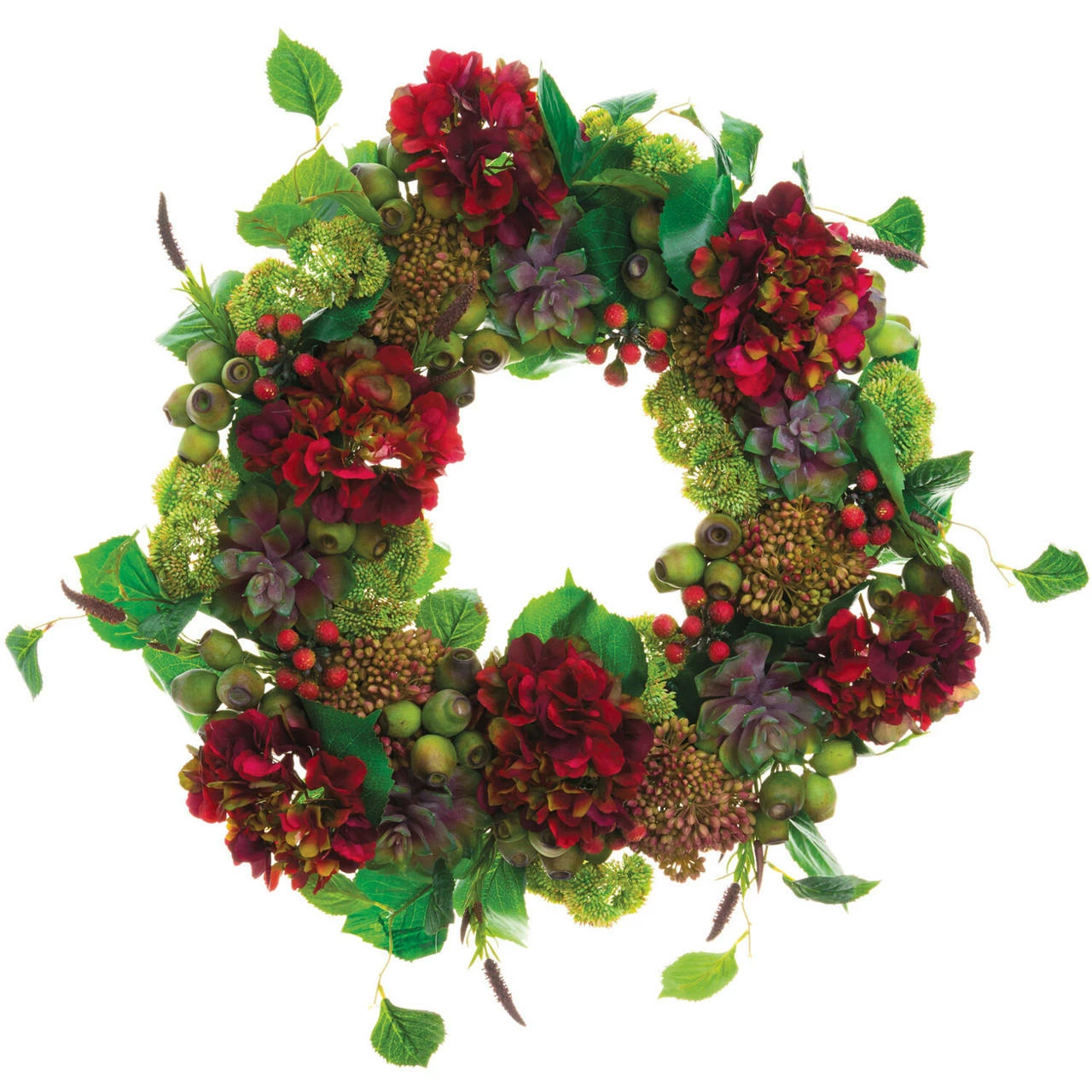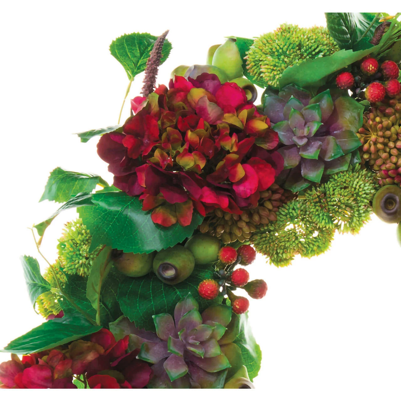 - Durable PVC branches with a mix of hydrangea, echeveria, and sedum