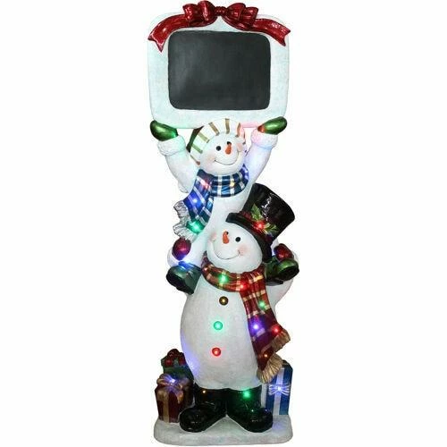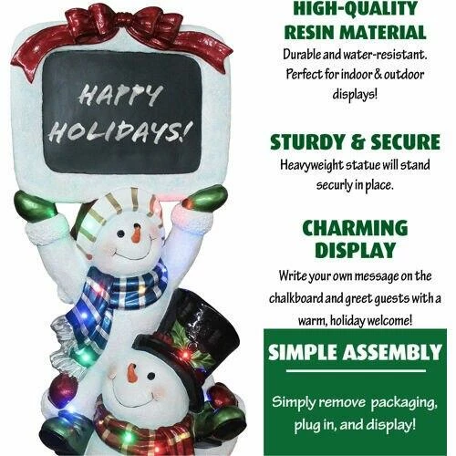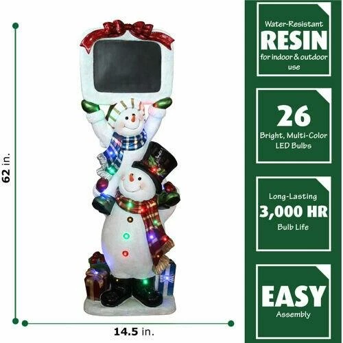 Capture the beauty, magic, and wonder of the Holiday Season with oversized Christmas decorations from Fraser Hill Farm. Our collection of indoor/outdoor resin figures will help you create a delightful holiday display everyone will love. Each high-quality statue is crafted from weather-resistant resin then brightly painted with realistic details. Collect them all! This 5-feet tall Stacking Snowman Pair features 26 multi-color LED lights and holds a chalkboard, perfect for writing a personal holiday message (chalk not included). For irresistibly unique decor that celebrates the spirit of Christmas, count on quality products from Fraser Hill Farm.