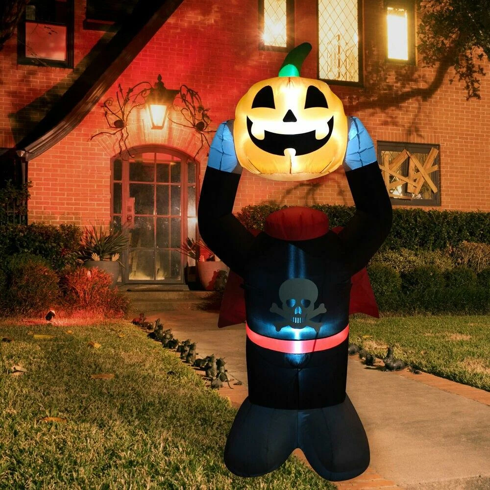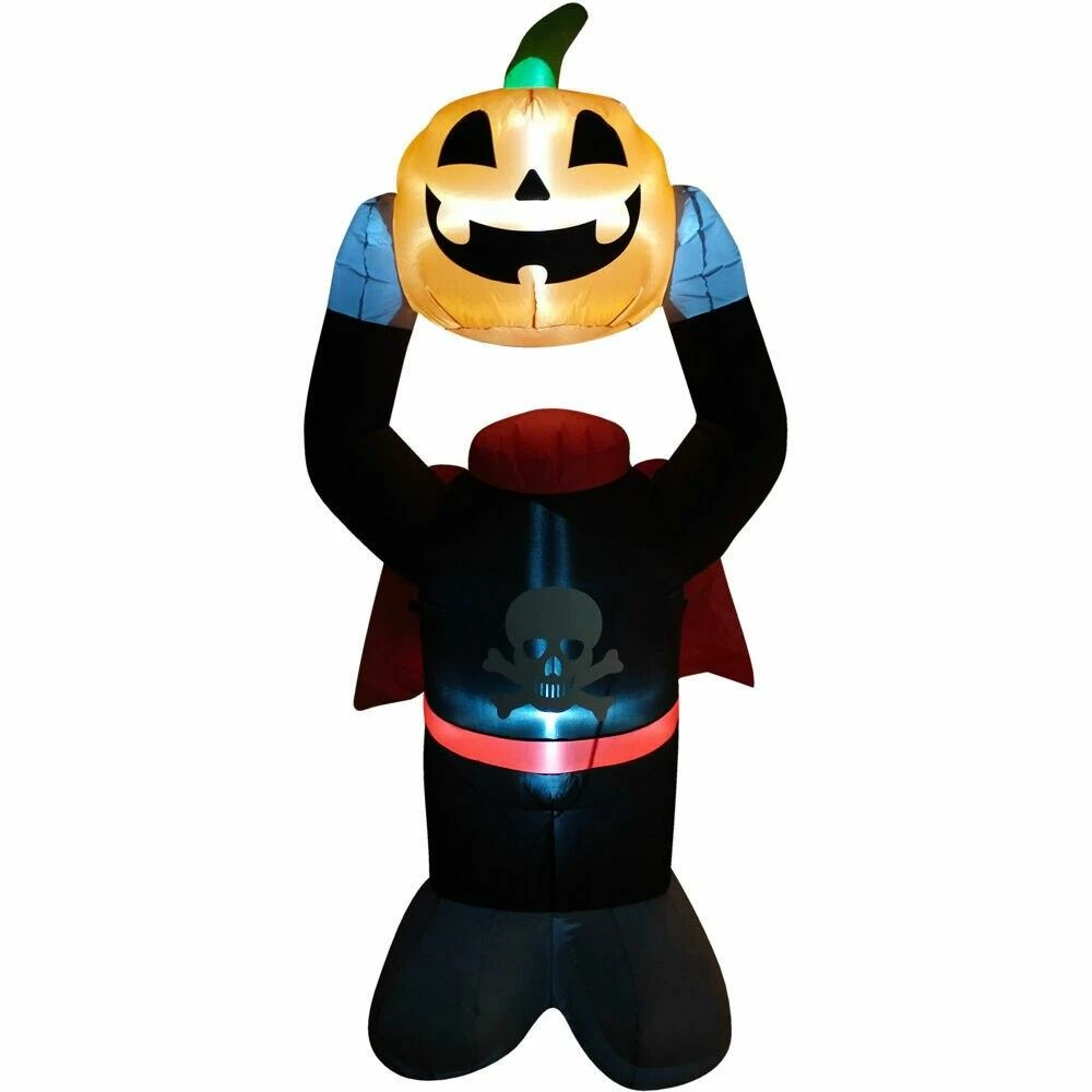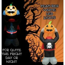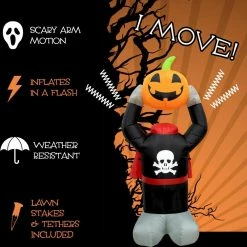 Your neighbors will lose their heads when they see your pre-lit 6-ft. 6-Ft. Headless Pumpkin Inflatable with Arm Motion and Lights. This animatronic inflatable will be the centerpiece of your own personal haunted house. At 6 feet tall, it’s big enough to make the neighbors notice but still works in smaller yards or walkways. The inflatable’s moving arms are the perfect trick to give your trick-or-treaters a scare without giving them nightmares. The treat is how quick and easy it is to set up with included lawn stakes and ropes for secure installation. The inflatable is outfitted with internal white LED lights and internal fan so all you need to do is unpack it, plug it in, stake it down and you’ll be ready for some scary fun all Fall long. Created out of durable, weather resistant polyester, you won’t need to worry about holes. Your inflatable will last year after year and scare after scare. With Haunted Hill Farm, you’ll have everything you need to be voted the scariest house on the block!