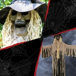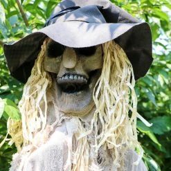 Be afraid! Be very afraid of Haunted Hill Farm’s Haunted Cornfield Collection. These blood-curdling creatures are sure to terrify any trick-or-treaters, co-workers, or customers. The Hunter received his name for a very good reason. This terrifying haunted scarecrow abandons his post in the cornfield each Halloween looking for new prey. If visitors aren’t deterred by his dark attire and straw hair, they’re sure to be terrified by his dark skull face and sinister, open-mouthed toothy smile. Bend his adjustable arms into various haunting positions for fresh scares and screams. Stand him next to your bowl of treats or hang him from your porch to frighten guests from above. If there’s one thing The Hunter knows how to do, it’s scare people.