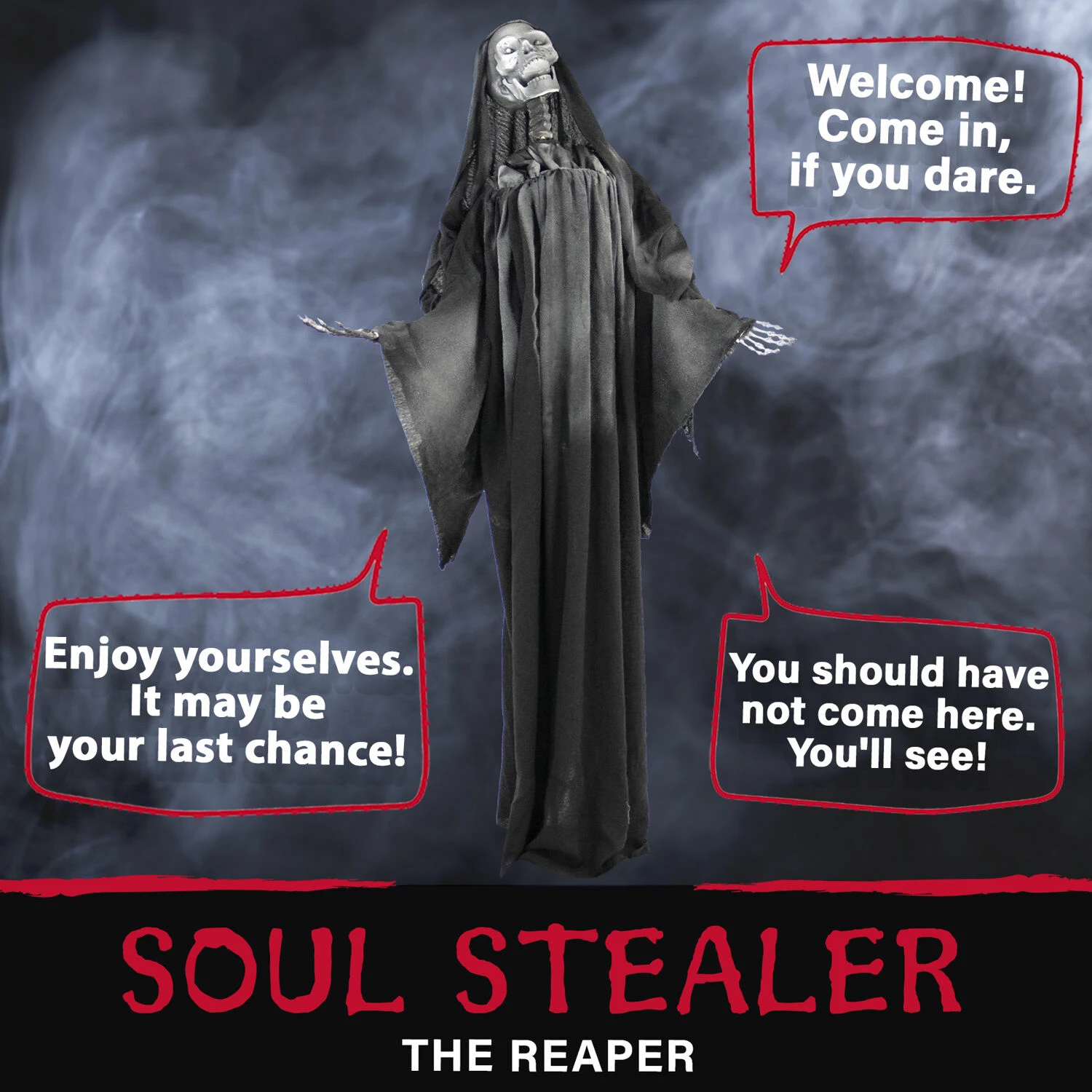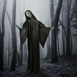 Be afraid! Be very afraid of Haunted Hill Farm’s Reaper collection. These blood-curdling creatures are sure to terrify any trick-or-treaters, co-workers, or customers. If you see Soul Stealer the Reaper, it’s time to run the other way. Straight from the depths of the underworld, this demon is still covered in ash from his journey. He can’t help but laugh with excitement. Soul Stealer’s eyes flash white to cast light on his victims. His adjustable arms can be moved to cover his wicked toothy smile or extended to beckon visitors closer. Whether suspended from his hanging loop or propped on his stand, everyone will feel his wicked presence. His long black cloak blends him into the night as he patiently waits for a snack to stumble his way. If you invite Soul Stealer to your home this Halloween, be warned. It isn’t candy he’ll be collecting!