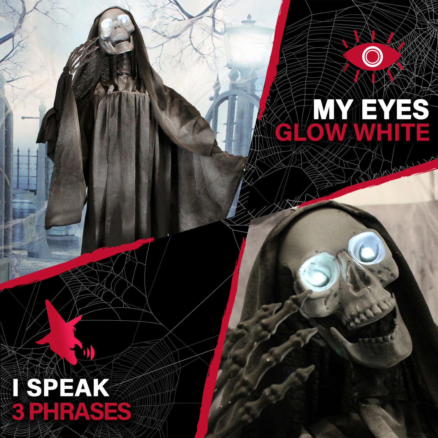 - Wicked toothy grin, bony skeleton fingers, and lifelike skull