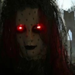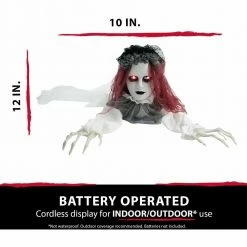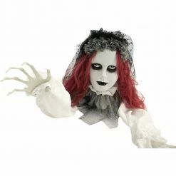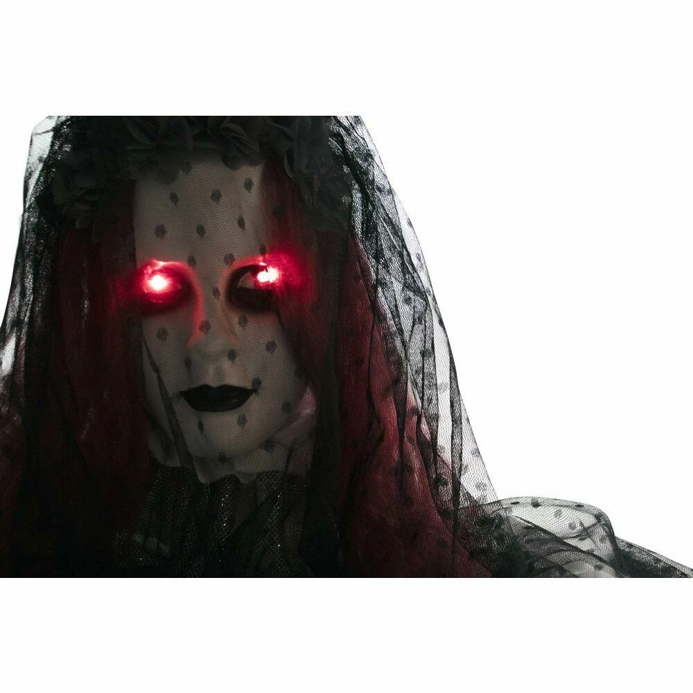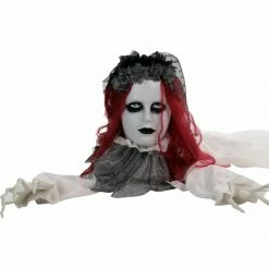 - 65 in. long animatronic haunted bride for indoor and covered outdoor display