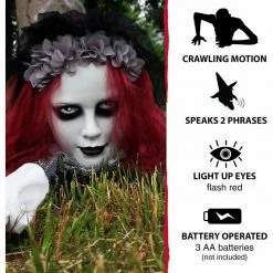 Be afraid. Be very afraid of Haunted Hill’s Crawler collection. These blood curdling creatures are sure to terrify any trick-or-treaters, co-workers, or customers. The Southern Belle from Hell does not have a charming bone in her body. She was once a lovely bride, but after being stood up at the altar, she is ready to show the scary side of beauty. Her red flashing eyes and chilling cries for help fill the night with terror. She crawls across the floor with a sinister determination, bringing unexpected scares from room to room. Her bright white skin, black lips, and dark eye circles contrast sharply with her blood-red hair, making it impossible to forget this petrifying demon. Ripped clothing, a sheer black veil, and long skeleton hands are the finishing touches to this Belle of your nightmares. Best be careful. You might not see her coming.