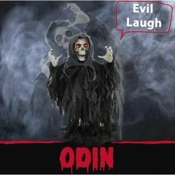 Be afraid. Be very afraid of Haunted Hill’s Pop-Up Groundbreaker Collection. These blood curdling creatures are sure to terrify any trick-or-treaters, co-workers, or customers. If you seek sheer terror this Halloween, look no further. Odin will horrify any visitor who dares cross his path. The reaper’s skeleton arms and head rock back and forth as he cackles into the night. He searches for souls in the darkness, eyes aglow with red light. His frightening looks are intensified by background noises of thunder and haunting screams. His dark hooded figure can be perched next to your treats or hung to petrify victims dusk ?til dawn. Odin’s wicked open-mouth grin and long black fingernails only add to his already unnerving appearance, and are enough to stop guests in their tracks. Welcome Odin to your home this Halloween, but be warned. He’s out to collect more than just candy.