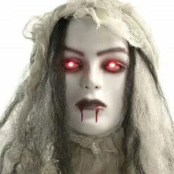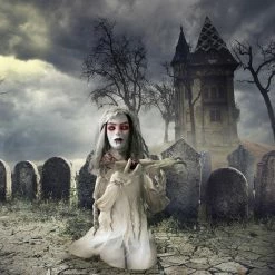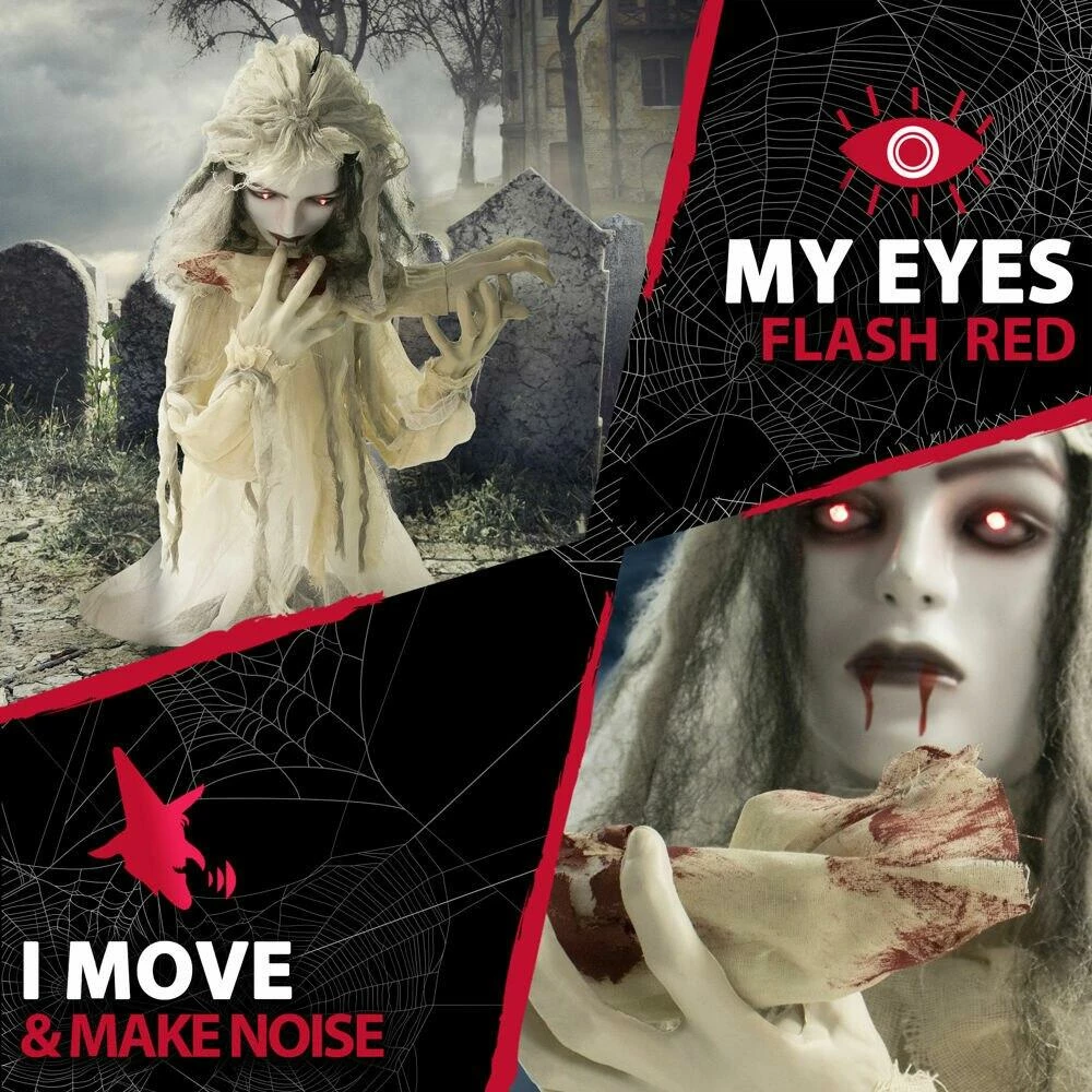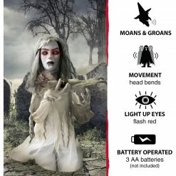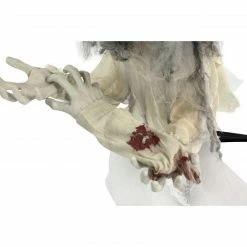Be afraid. Be very afraid of Haunted Hill’s Pop-Up Groundbreaker Collection. These blood curdling creatures are sure to terrify any trick-or-treaters, co-workers, or customers. Hannah the Cannibal was left at the altar and is out for revenge. She cares little about where her vengeance is directed, and driven by bloodlust, she stalks and devours her prey. Her soulless flashing red eyes illuminate the night and her moans echo through the darkness. When movement or sound approaches, Hannah’s body moves up and down as she chomps away at the arm of her ex-love. Hannah’s ominous half-figure is able to fit seamlessly next to your haunted treats, on a counter space, or on any hanging hook. Her moving body and her eerie music makes her presence alarmingly known to her victims, no matter where she rests. Hannah is the cruel finishing touch for your haunted house this Halloween!