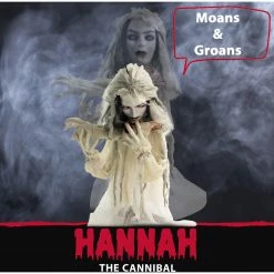 - Hannah the Cannibal is sound and touch activated – Head bends, haunted music plays, moans, and eyes light up red