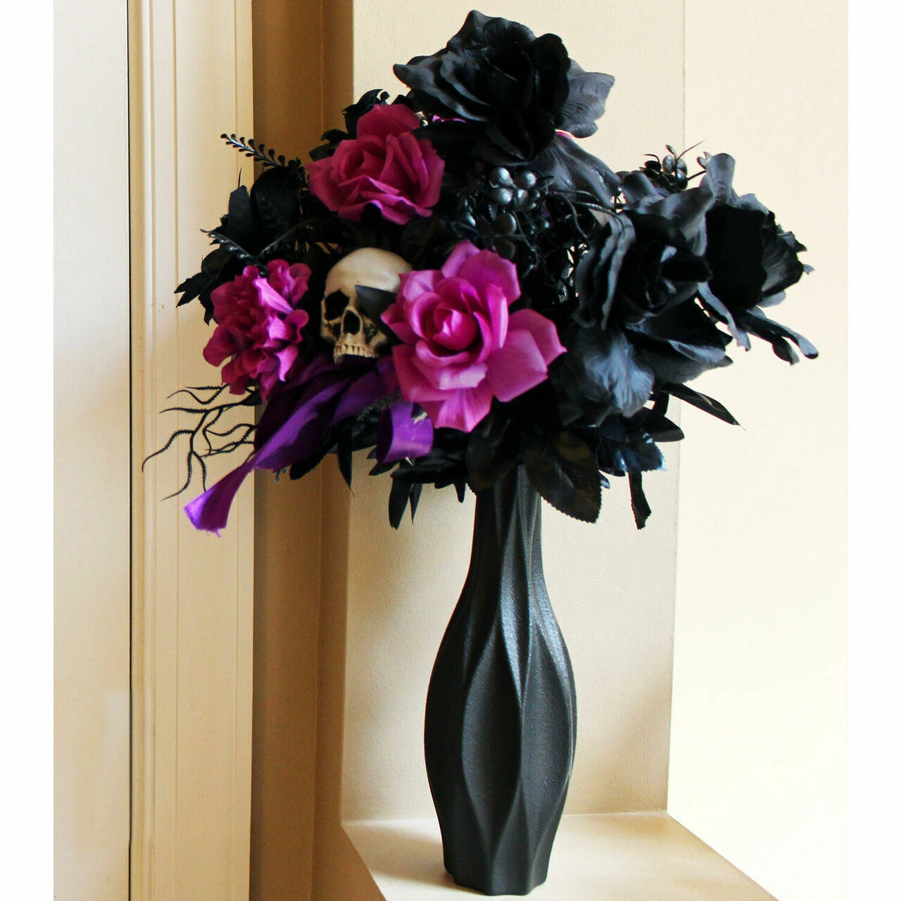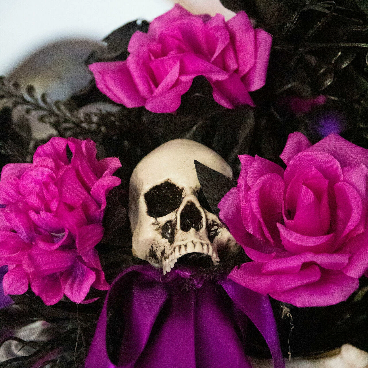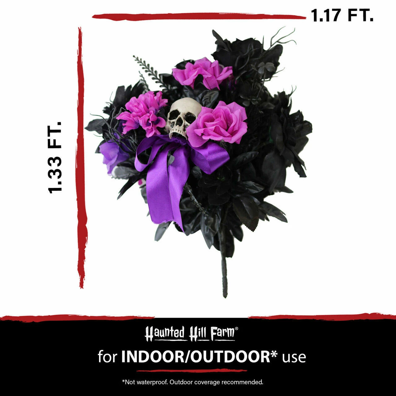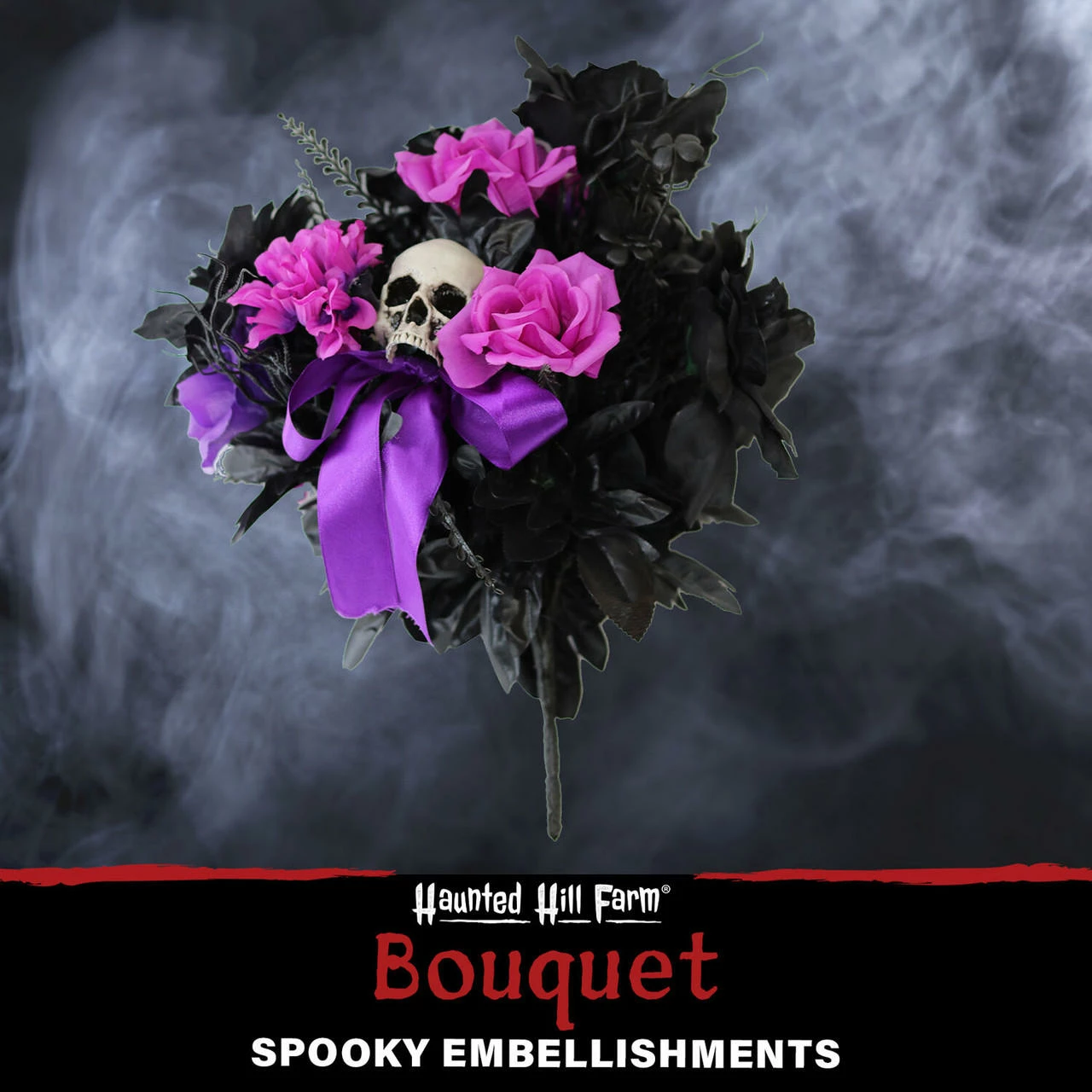 Accentuate the goth side of Halloween with this spooky bouquet from Haunted Hill Farm. Black, pink, and purple flowers are arranged in a lovely, round bouquet topped with a pink bow and skull peeking out among the buds. Place this piece in its own spooky vase to complete a festive tablescape for a unique Halloween look. Better yet, pair it with our spooky skeleton vase sold separately (HHSKELVASE-1). Be the spook of the town this Halloween with Haunted Hill Farm.
