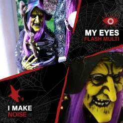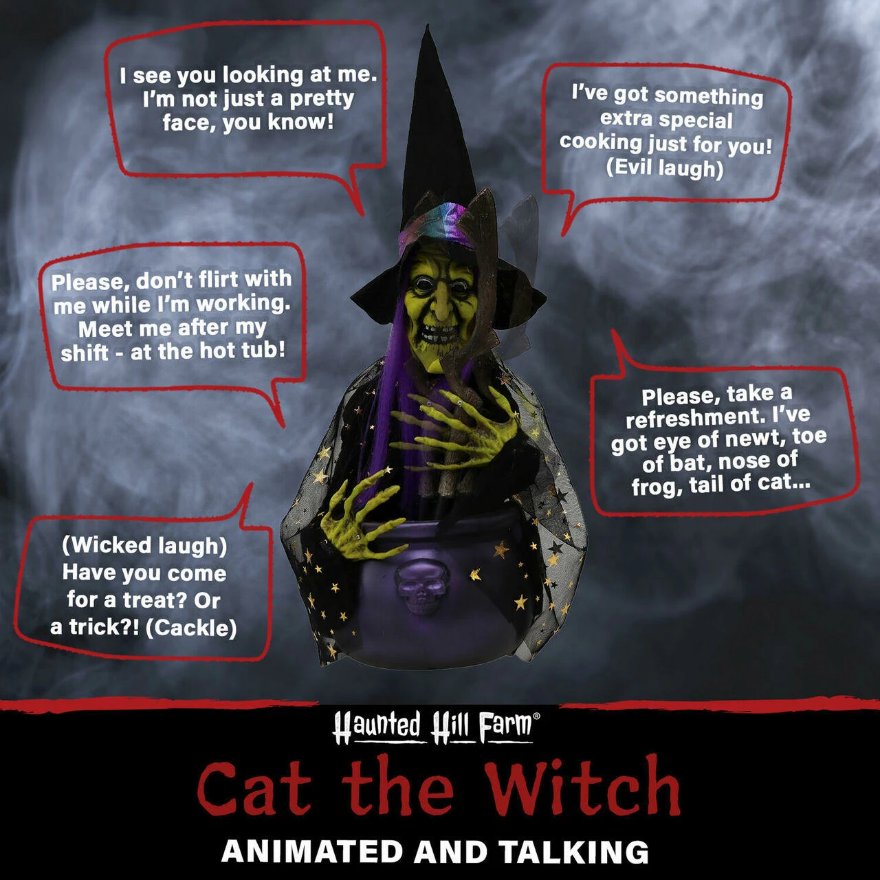 - Cat the witch is touch activated-hands stir pot, lights flash red and green, greets visitors and talks