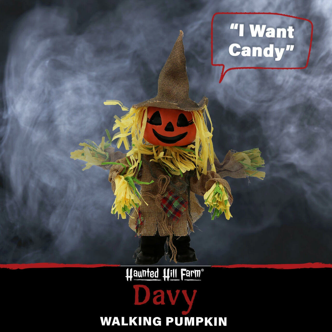 Halloween isn’t just for scaring anymore; it’s also about delightfully spooky celebrations and candy, of course! Haunted Hill Farm’s Davy, the walking pumpkin scarecrow, is ready to bring in the autumn season fun with his burlap body and witch hat. He’ll get the kids in a sweet mood by playing the aptly chosen song, I Want Candy, and walking along to the music with his hay accents like a real scarecrow. Surprise and delight trick-or-treaters with Davy’s fun performance and be the house remembered for more than just the candy selection.