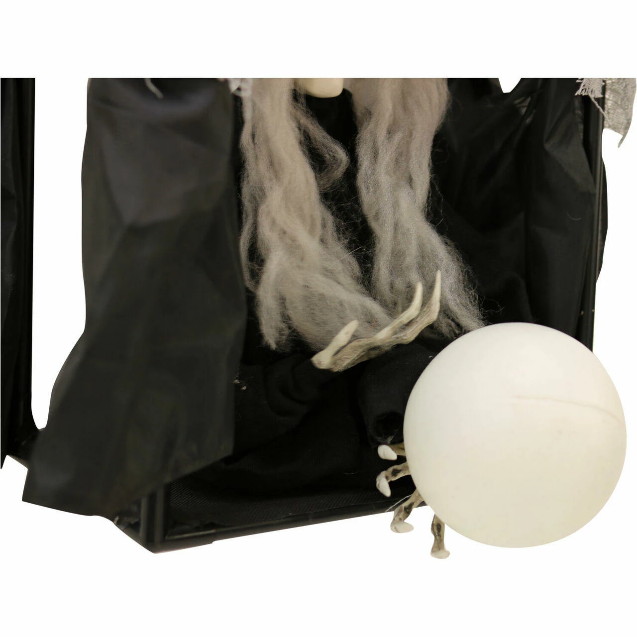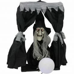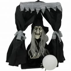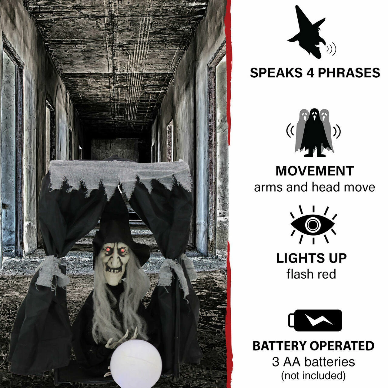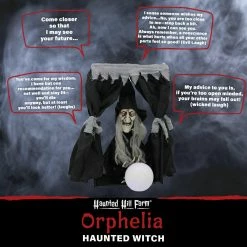 Be afraid. Be very afraid of Haunted Hill Farm’s Haunted Curses and Cauldrons Collection. These blood curdling creatures are sure to terrify any trick-or-treaters, co-workers, or customers. Invite Orphelia the Witch to your home for the most cursed Halloween yet. The cackling hag’s eyes flash a fearsome red as she beckons visitors near. Come closer, she says. She wants to see your future? I wouldn’t get too close if I were you. Backed by stormy sounds and ominous music, Orphelia’s snarky predictions and disturbingly cynical advice are sure to startle even the boldest of trick-or-treaters. Her arms and head sway beneath her dark witch costume, warning visitors of her unsettling powers. Hang the wicked witch and her crystal ball from your porch, in your doorway, or above a bowl of treats to give guests the fright of a lifetime. But be warned, your home might just be the most horrifying on the block.