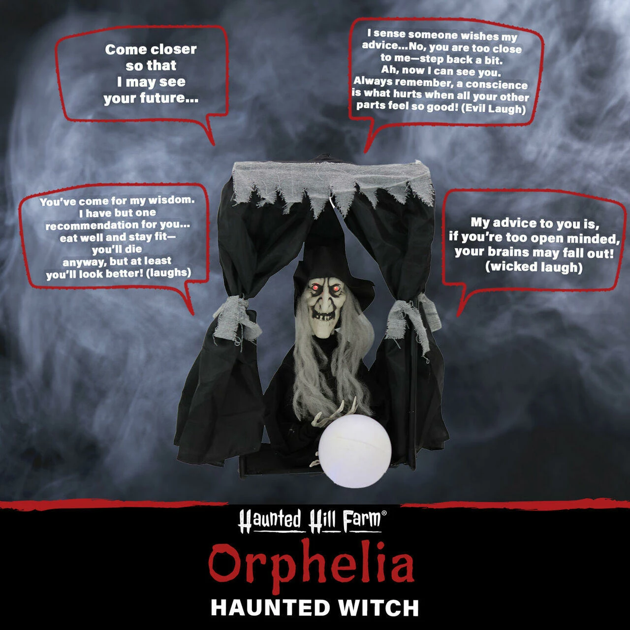 - Touch activated- Orphelia’s eyes flash red, arms and head sway, plays thunder sounds and ominous music, speaks