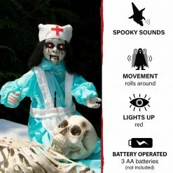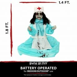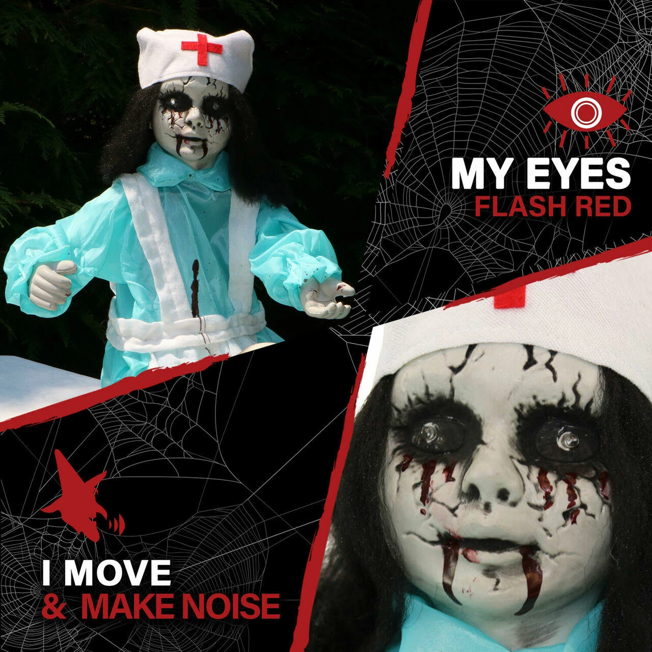 Be afraid. Be very afraid of Haunted Hill Farm’s doctor collection. These blood curdling creatures are sure to terrify any trick-or-treaters, co-workers, or customers. Carrie’s blood-stained apron is just the beginning of her creepy appearance, with her sickly skin and sunken-in eyes adding to the scare factor. When touched, her eyes light up red and she sings and speaks in nursery rhymes and scary voices. Carrie’s the type of nurse you hope to never see when you need help, but she’s always available to terrify your guests. Be the spook of the town this Halloween with Haunted Hill Farm.