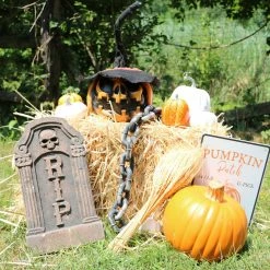 Be afraid. Be very afraid of Haunted Hill Farm’s Haunted Cornfield Series. These blood curdling creatures are sure to terrify any trick-or-treaters, co-workers, or customers. It seems that this Halloween, one peculiar pumpkin has escaped the patch. Dressed in a witch hat and donning a sinister dark smile, this evil jack-o-lantern shakes to frighten unsuspecting visitors. Spooky noises, evil laughter, and the caws of crows fill the air around the ghoulish gourd, warning trick-or-treaters not to get too close. Place him next to your candy bowl or at your doorstep to send delightful frights into the Halloween night.