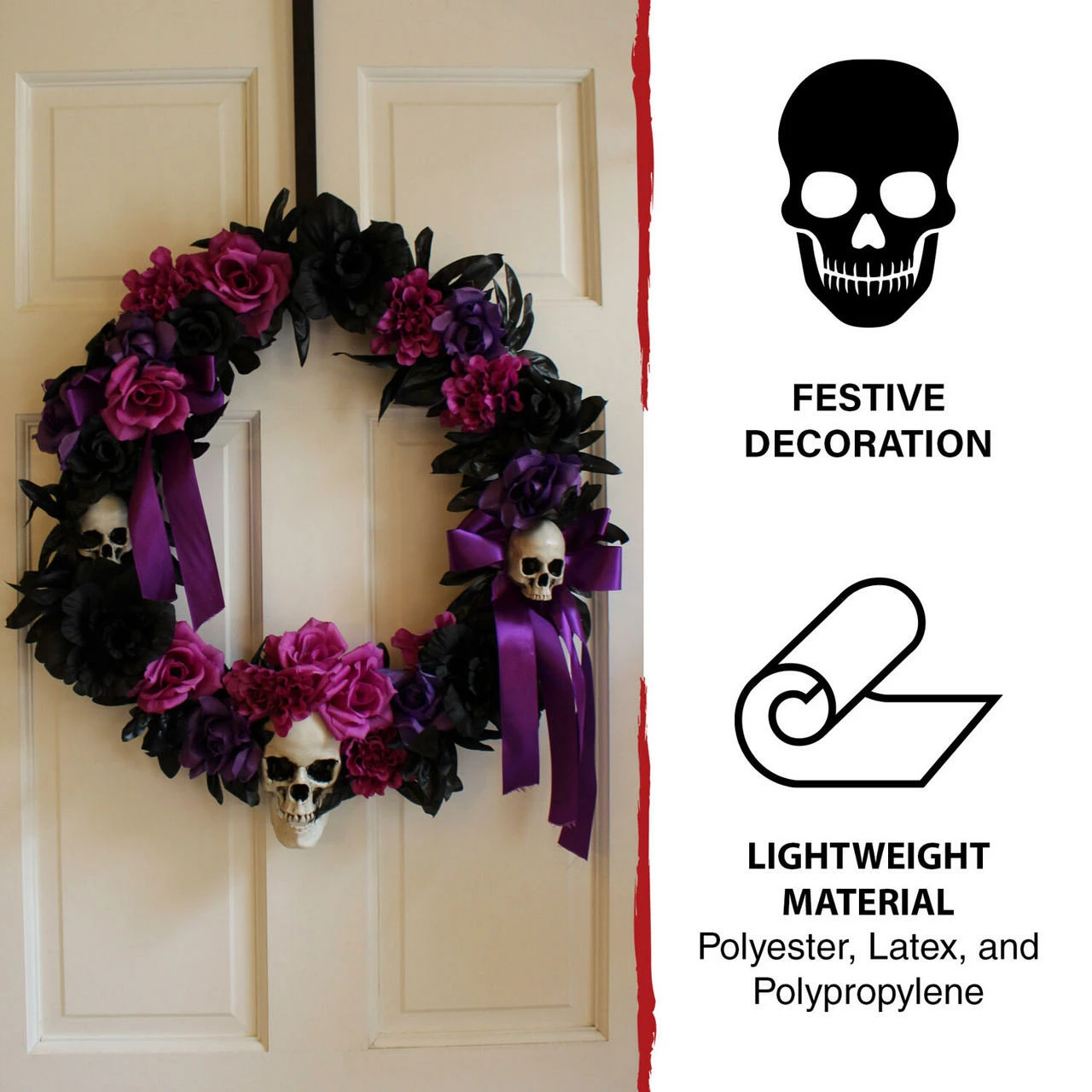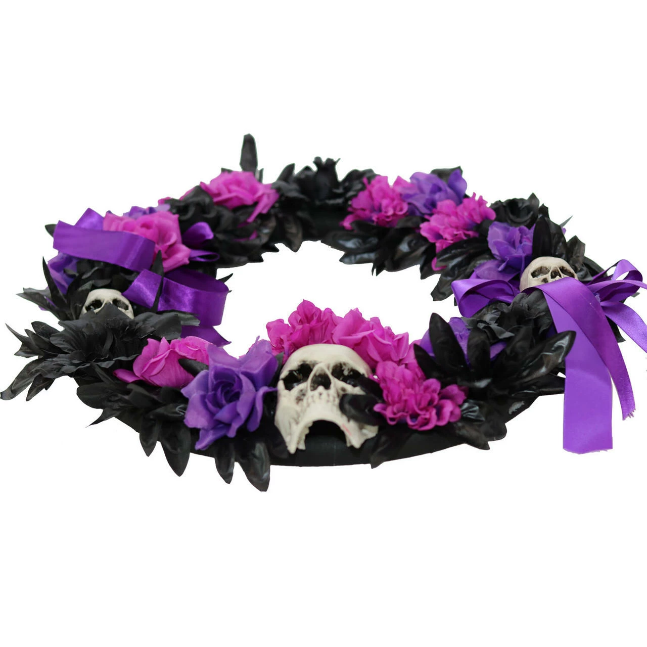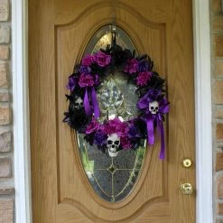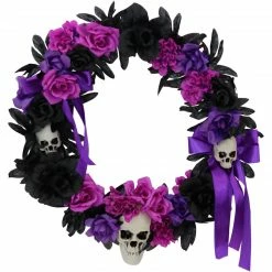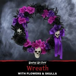 Be afraid. Be very afraid of Haunted Hill Farm’s Decoration Collection. These blood curdling decorations are sure to terrify any trick-or-treaters, co-workers, or customers. This Halloween wreath will add the perfect creepy touch to your holiday decorations. Accented with purple, black, and pink ribbons and flowers, it will curse your door with an ominous, sinister air. Three skulls on the wreath give it an extra chilling essence-they will stare out at your visitors with deathly smiles and hollow eyes. Accent your home with festive, fearsome decorations with this dark holiday wreath from Haunted Hill Farm.