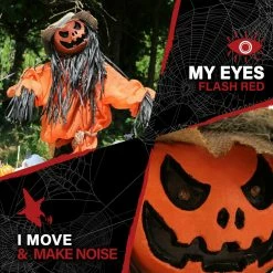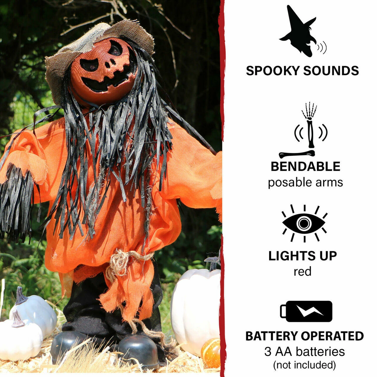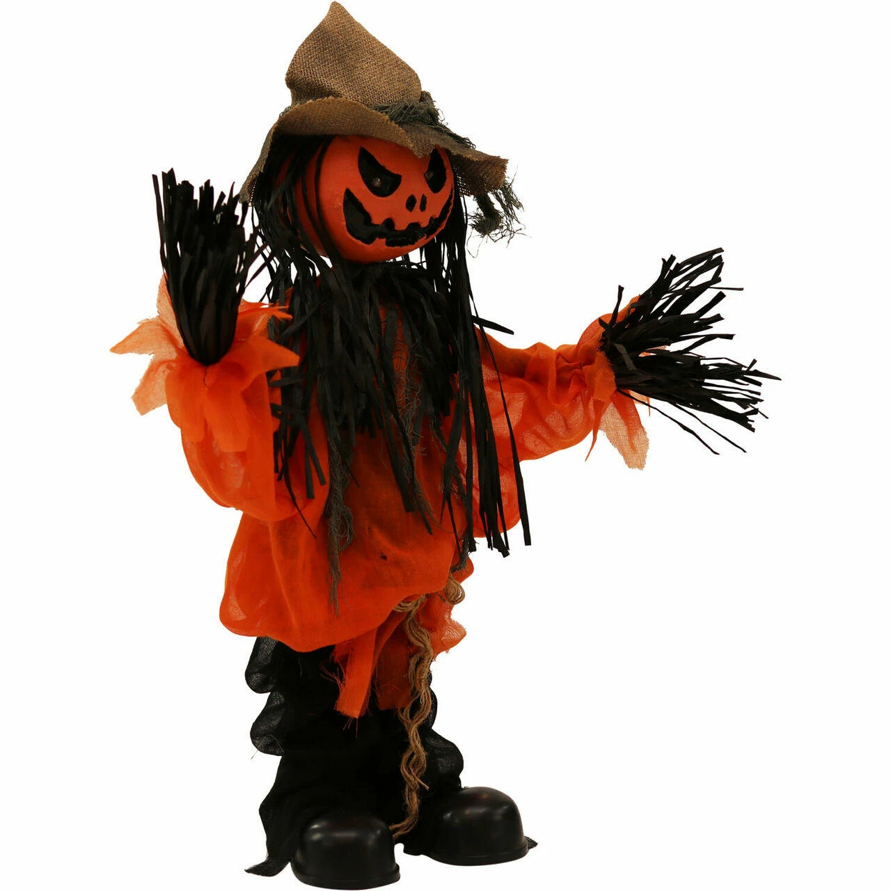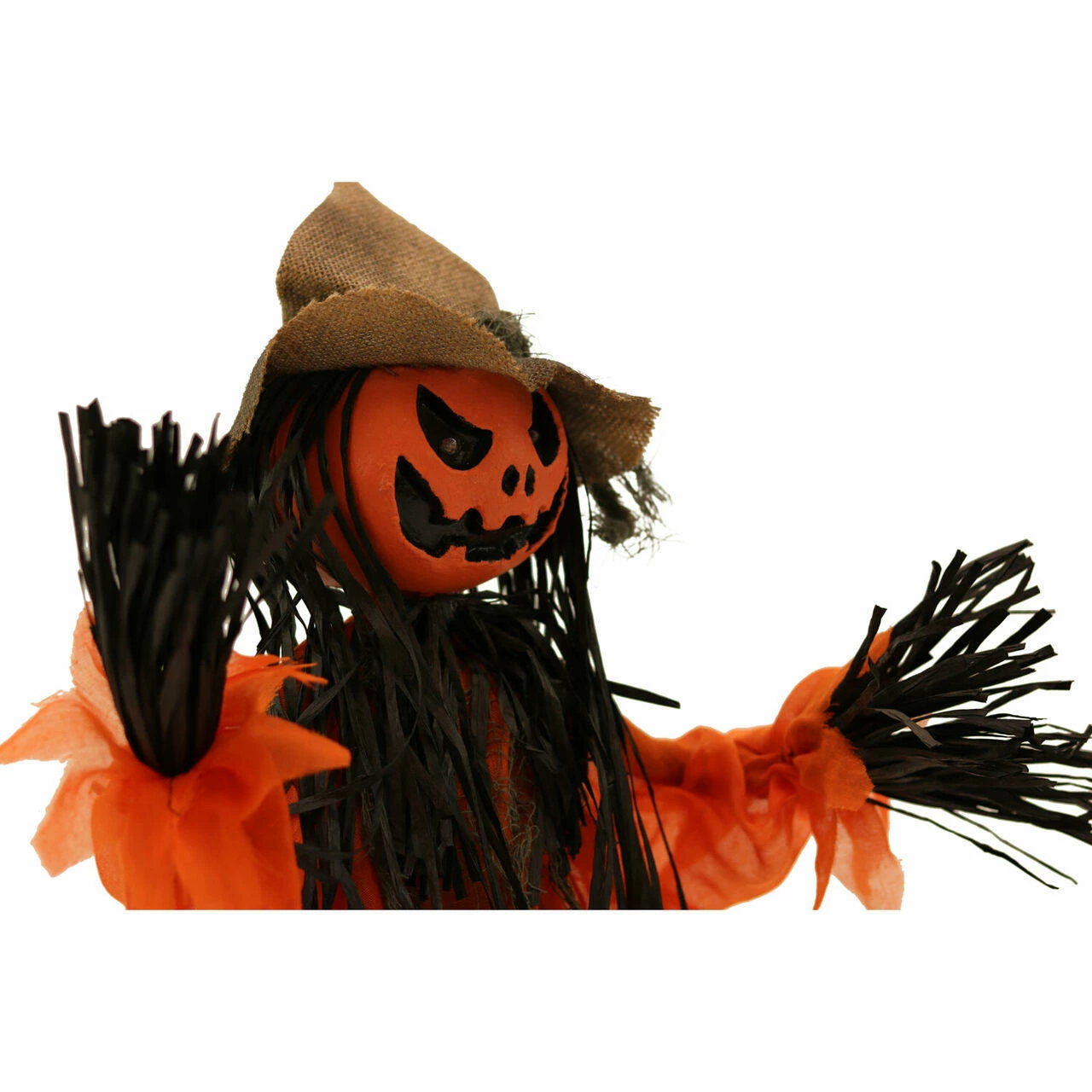 - 1.9-ft. standing pumpkin scarecrow for indoor and covered outdoor display
