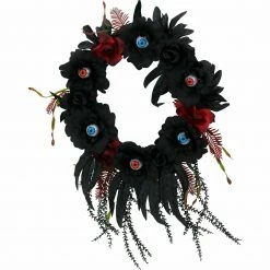 Be afraid. Be very afraid of Haunted Hill Farm’s New, Exclusive After Dark Collection. These blood curdling decorations are sure to terrify any trick-or-treaters, co-workers, or customers. This Halloween wreath will add the perfect creepy touch to your holiday decoration. Made with black flowers and red accent flowers, it will give your door an ominous, sinister vibe. Six round eyeballs on the wreath curse it with an extra chilling essence—the eyes will stare out at your visitors as they light up red and blue. Give your home a festive, fearsome accent with this dark holiday wreath from Haunted Hill Farm.