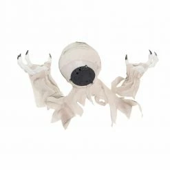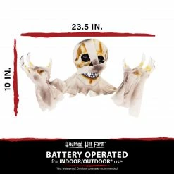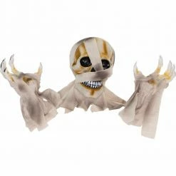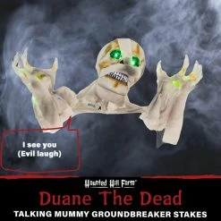 Be afraid! Be very afraid of the Jebediah Bones Gravedigger Collection from Haunted Hill Farm. Duane the Dead, our staked mummy groundbreaker, is just what you need to turn your home into the scariest house on the block. Battery operated and bump activated, he speaks one phrase with evil laughter to the sounds of thunder and lightning while his eyes and hands flash with bright green lights. This spooktacular creature will step up your Halloween decor and delight your guests.