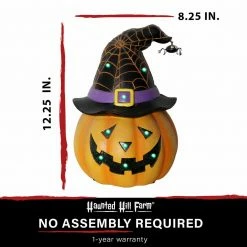 Add a little whimsy to your Halloween decor with our Pre-lit Jack O’ Lantern Halloween Decoration from Haunted Hill Farm. Standing 12.25-inches tall, our resin Jack O’ Lantern is battery-operated for convenient placement and can be used indoors or covered outdoors. Use alone or combine with our large variety of seasonal decorations to create a spooktacular display. Buy two to flank a door or a wide stairway. The green LED lights cast an eerie glow to set the perfect Halloween mood. For whimsical spooky fun this Halloween season, count on quality products from Haunted Hill Farm.