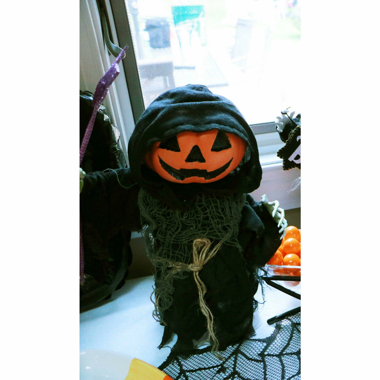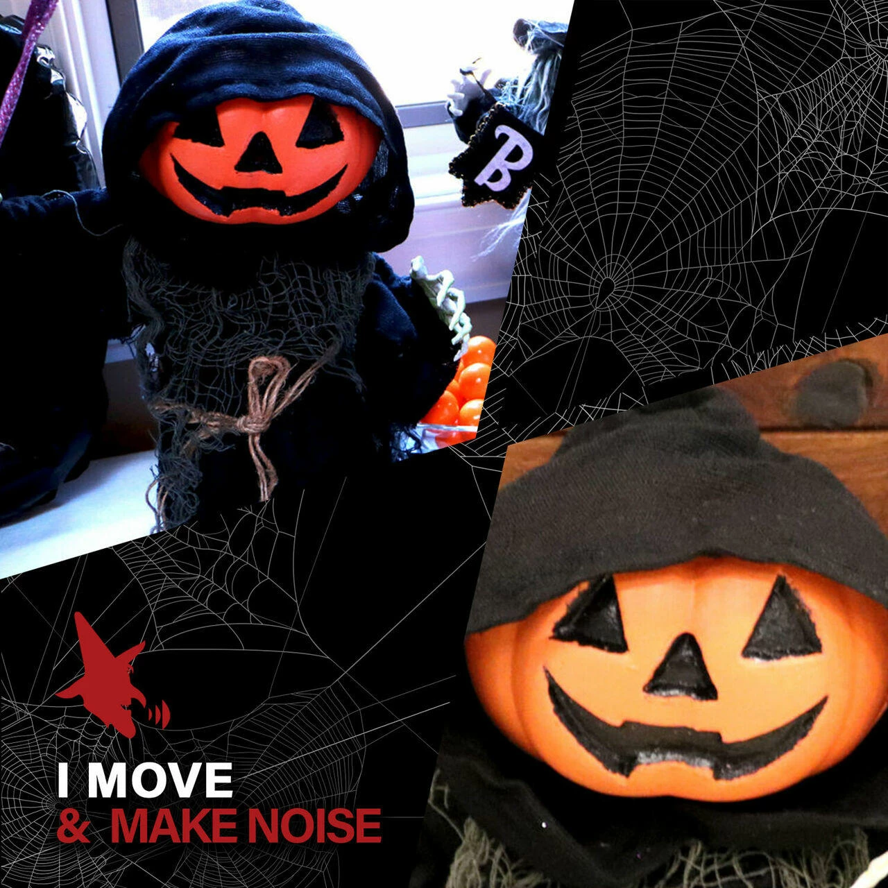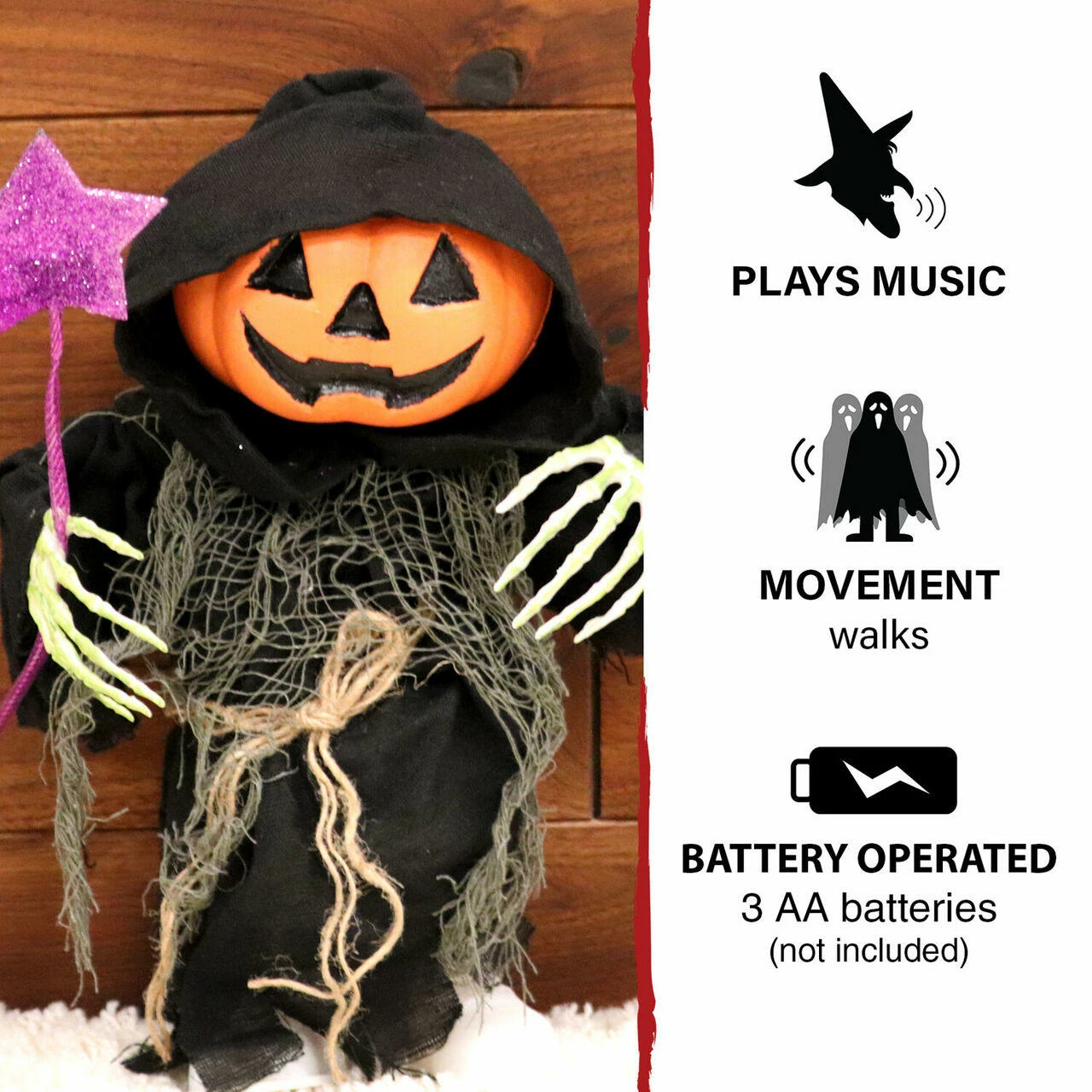 - 13-in. walking pumpkin reaper for indoor and covered outdoor display