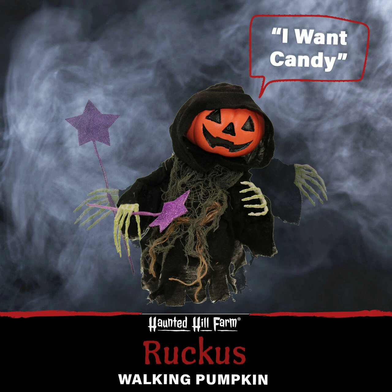 Halloween isn’t just for scaring anymore; it’s also about delightfully spooky celebrations and candy, of course! Haunted Hill Farm’s Ruckus, the walking pumpkin reaper, is ready to bring in the autumn season fun with his black hooded cloak and purple star wand. He’ll get the kids in a sweet mood by playing the aptly chosen song, I Want Candy, and walking along to the music with his skeleton hands. Surprise and delight trick-or-treaters with Ruckus’ fun performance and be the house remembered for more than just the candy selection.