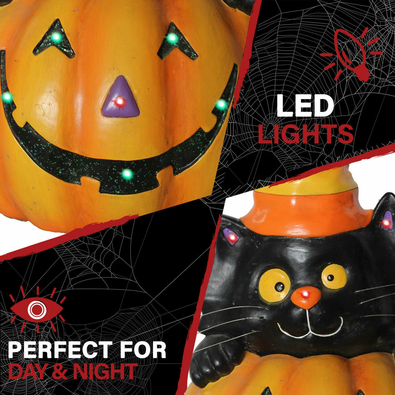 Add a little whimsy to your Halloween decor with our Pre-lit Jack O’ Lantern Cat Stack Halloween Decoration from Haunted Hill Farm. Standing 14.5-inches tall, our resin Jack O’ Lantern is battery-operated for convenient placement and can be used indoors or covered outdoors. Use alone or combine with our large variety of seasonal decorations to create a spooktacular display. Buy two to flank a door or a wide stairway. The multi colored LED lights cast an eerie glow to set the perfect Halloween mood. For whimsical spooky fun this Halloween season, count on quality products from Haunted Hill Farm.