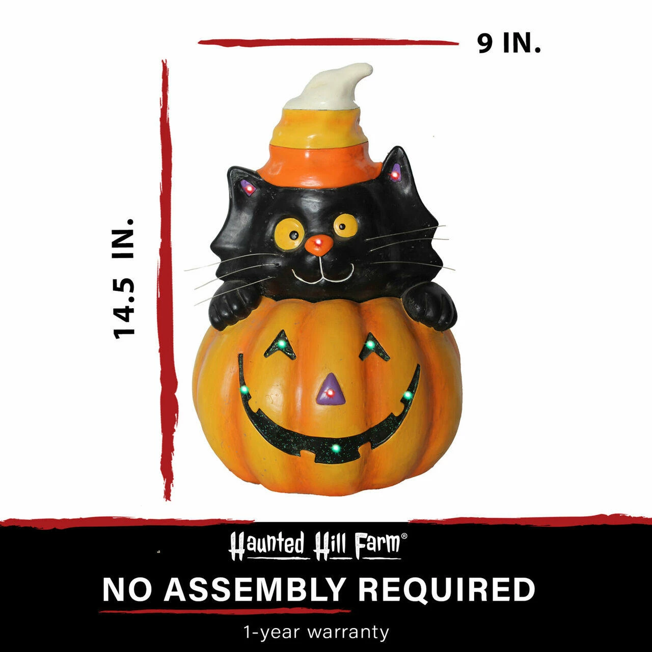 - Resin Jack O’ Lantern with black cat and jaunty, candy corn hat