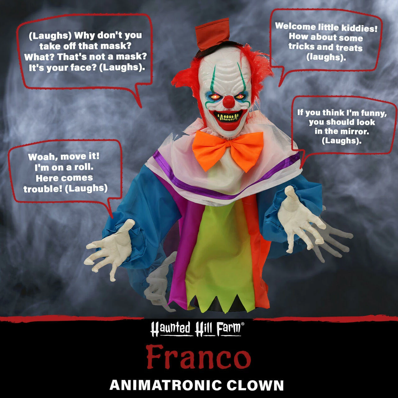 Be afraid! Be very afraid of Haunted Hill Farm’s Haunted Circus Collection. These blood-curdling creatures are sure to terrify any trick-or-treaters, co-workers, or customers. There’s nothing funny about Franco the Clown. If his unexpected pop-ups, sinister red-lipped sneer, and wild orange hair don’t terrify visitors, his chilling insults will. Don’t be too offended by the evil clown’s rude remarks—he has quite an unsettling sense of humor. Franco’s jeers are backed by spooky circus music. He’s truly a petrifying one-person show. Set Franco at your doorstep or near the candy bowl to give guests the fright of a lifetime. But don’t worry, it’s all just fun and games…right?
