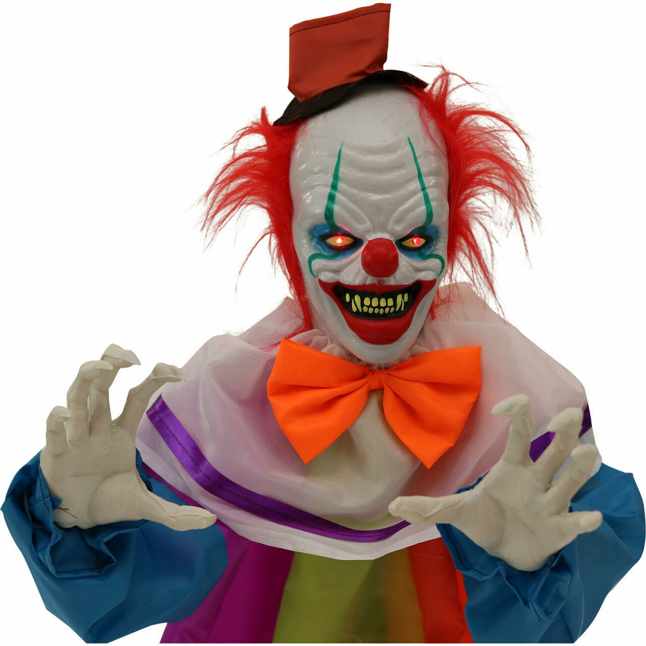 - Clown white hands and face with colorful makeup and costume