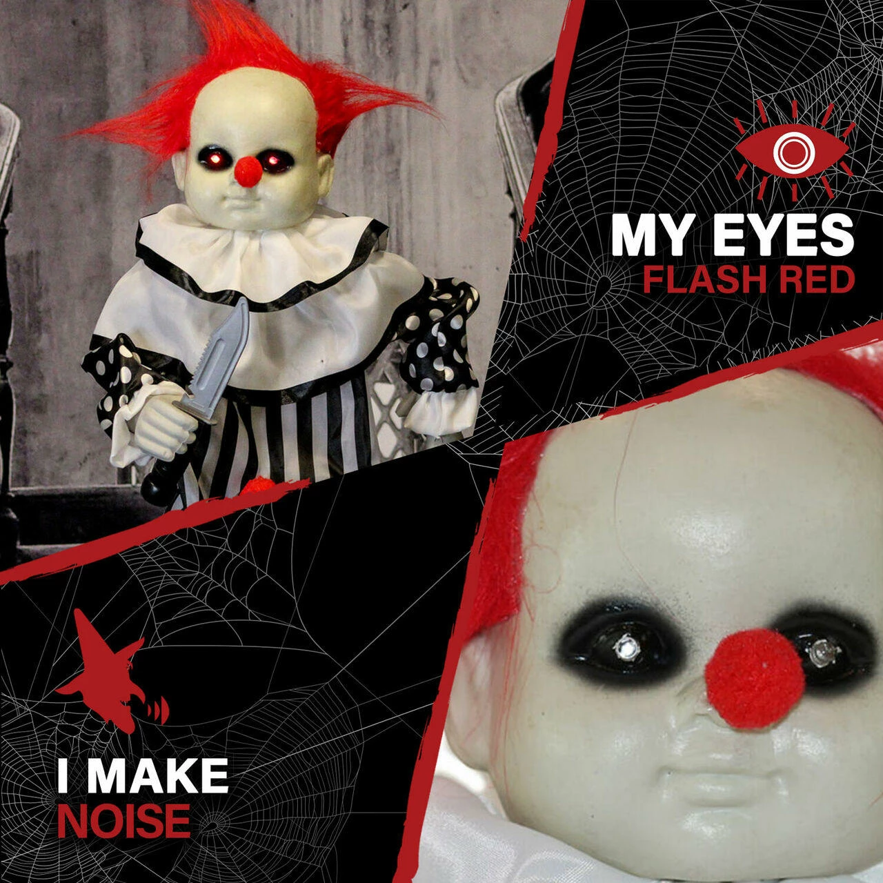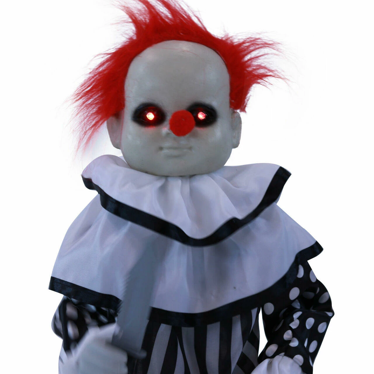 Be afraid. Be very afraid of Haunted Hill Farm’s haunted circus collection. These blood curdling creatures are sure to terrify any trick-or-treaters, co-workers, or customers. Master Chuck the circus clown may be small, but that doesn’t make him any less horrifying than the rest of his creepy friends. His traditional circus outfit gets a spooky twist with black and white patterns accented with blood red splashes of color and ghoulish, hollowed-out eye makeup, making him look risen from the dead. On top of that, red LED bulbs light up his eyes to give them an extra penetrating look in the dark. Touch-activated movements and sounds will startle any guests with jarring screeches and screams. Coulrophobes beware, Master Chuck is waiting to scare.