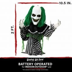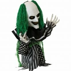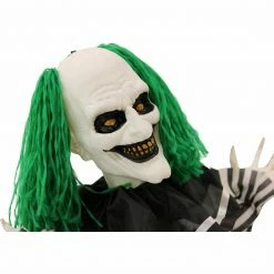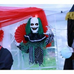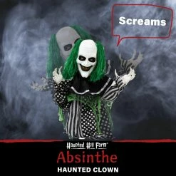 Be afraid. Be very afraid of Haunted Hill Farm’s Haunted Circus Collection. These blood curdling creatures are sure to terrify any trick-or-treaters, co-workers, or customers. Absinthe the Clown is more than ready to perform this Halloween. Step right up! That is, if you dare? Trick-or-treaters will stop in their tracks when they see Absinthe’s fearsome, flashing red eyes, pale face, electric green hair, and sinister smile. He moves his arms and neck as thunder claps, storm sounds, and high-pitched screeches fill the air around him. Visitors won’t be too sure they want to visit his one-man-show. Bend Absinthe’s arms to beckon guests closer. Hang the clown above your treats or perch him on your doorstep for the ideal haunted circus scare.
