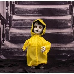 Be afraid! Be very afraid of the Lawn of the Dead Collection from Haunted Hill Farm. Our blood-curdling zombies are just what you need to turn your home into the scariest house on the block. Ralphie, the one-handed zombie boy, was playing with his toy boat when an evil seal with the taste for blood bit off his hand and infected him with a rare disease that gave him a taste for brains. Bump activated, he has animated arm movements and flashing yellow eyes. Ralphie speaks one phrase while atmospheric noises and creepy music play in the background. Battery operated with posable arms, he includes a stand and an optional hanging loop at the top of his head so you can display him however you want. Bring Ralphie home with you this Halloween to join your hoard of undead zombies and enjoy the creeps he will give your guests.