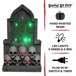 Add a little creepiness to your holiday decor with our Resin Halloween Decorations by Haunted Hill Farm. Our Tombstone with Skulls resin statue stands 2 feet tall – perfect for a graveyard scene or haunted house display that everyone will love. LED lights cast an eerie glow to set a frightful mood and delight your trick-or-treaters. Place it indoors or under a covered area outdoors. Buy two to flank a door or a wide stairway. Use alone or combine with our large variety of seasonal props to create a spooktacular display. Count on quality products from Haunted Hill Farm for lots of spooky fun this Halloween season.