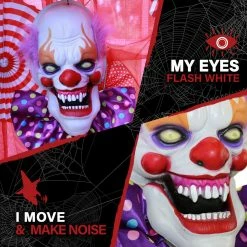 - 20-in. animated hanging clown head Halloween decoration for indoor or covered outdoor use