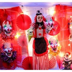 Be afraid! Be very afraid of Haunted Hill Farm’s Haunted Circus Collection. Our blood-curdling Hanging Clown Heads are sure to terrify any trick-or-treaters, co-workers, or customers. There’s something spooky, this clown will say, and with a wide-eyed smile, he’ll beckon you his way! Don’t be fooled by his grin – he doesn’t want to play! As his eyes flash a sinister white, they cast an eerie light on his dark hair and ghostly pale face. His thick red lips stretch into a wide smile, revealing his fangs. This crazy clown certainly looks excited, but you should be scared. Those empty demonic eyes, wild hair, and ominous voice add to his sinister energy. If not for his crazy eyes, one could almost think that this clown is friendly, and that’s exactly what he wants!