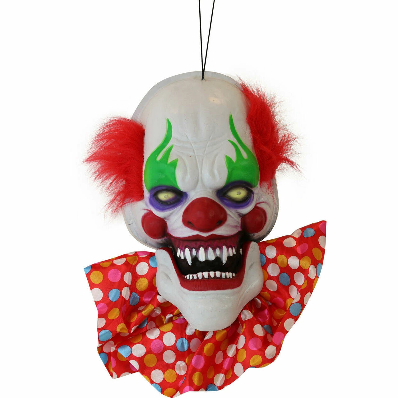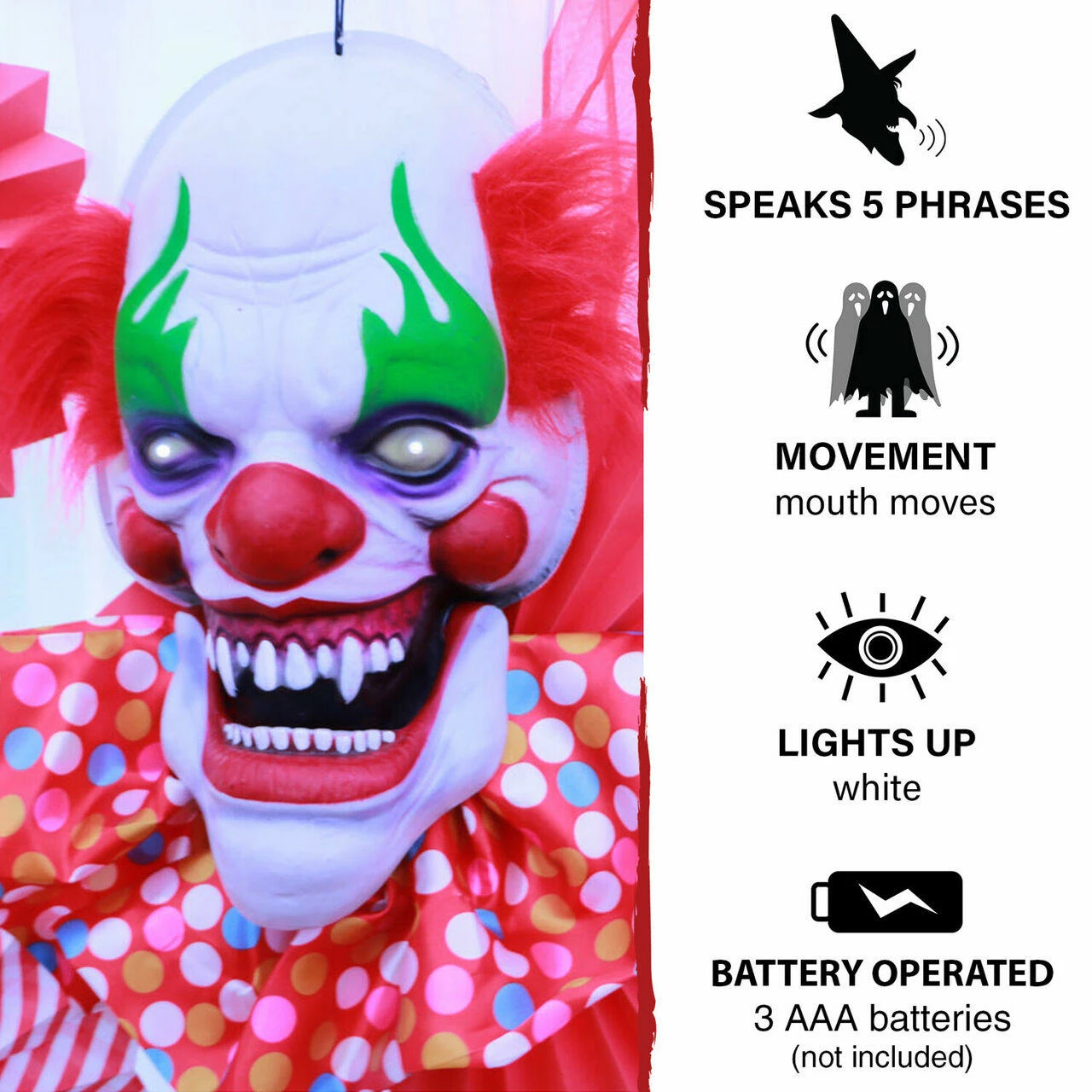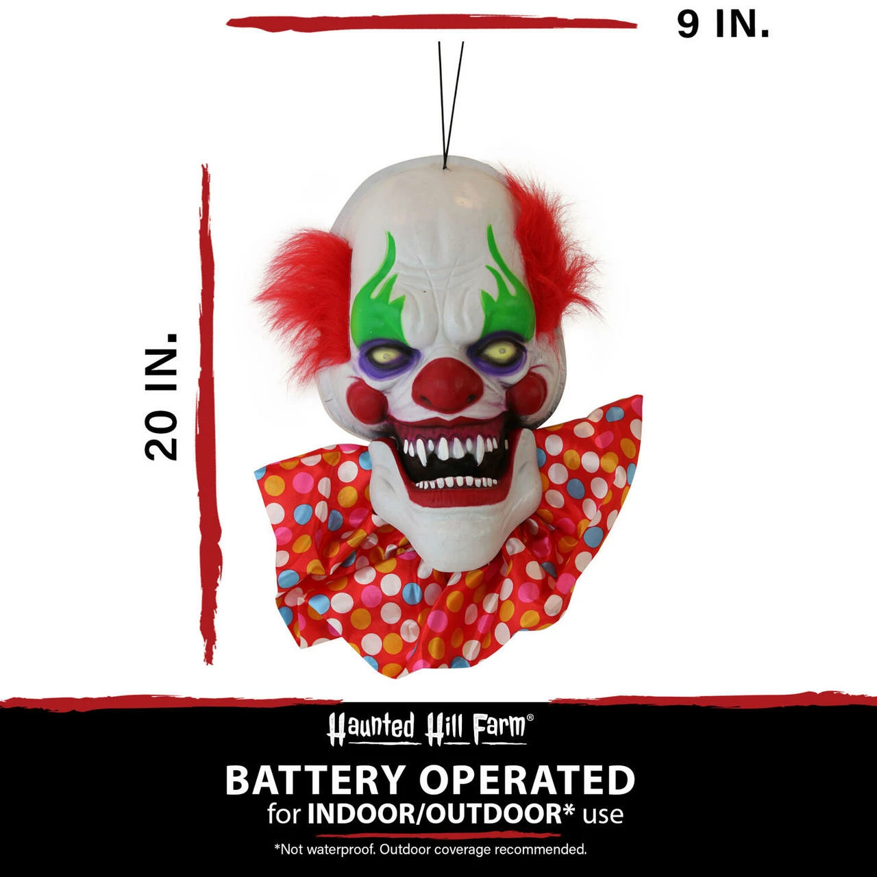 - 20-in. animated hanging clown head Halloween decoration for indoor or covered outdoor use
