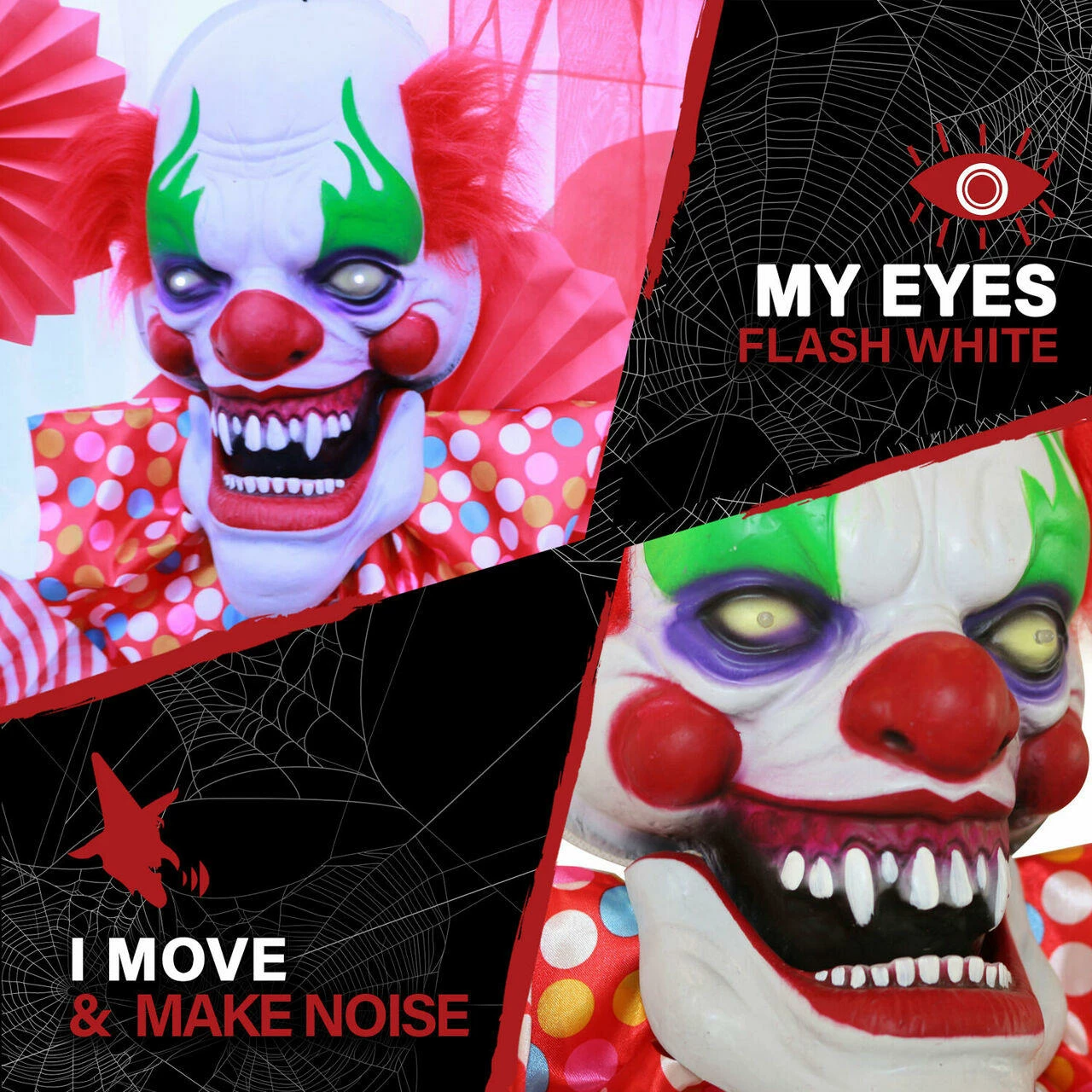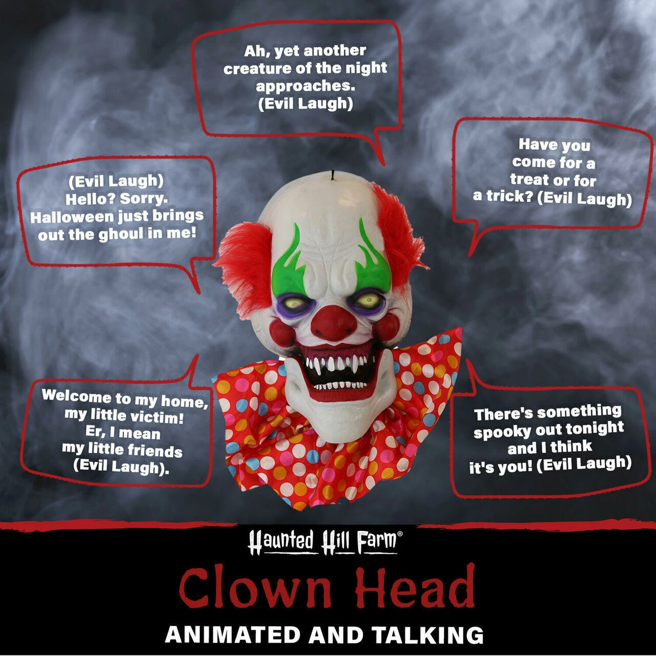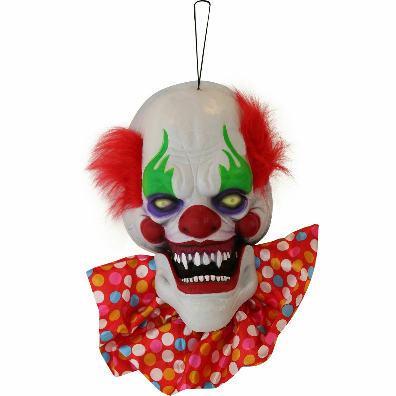 - 20-in. animated hanging clown head Halloween decoration for indoor or covered outdoor use