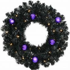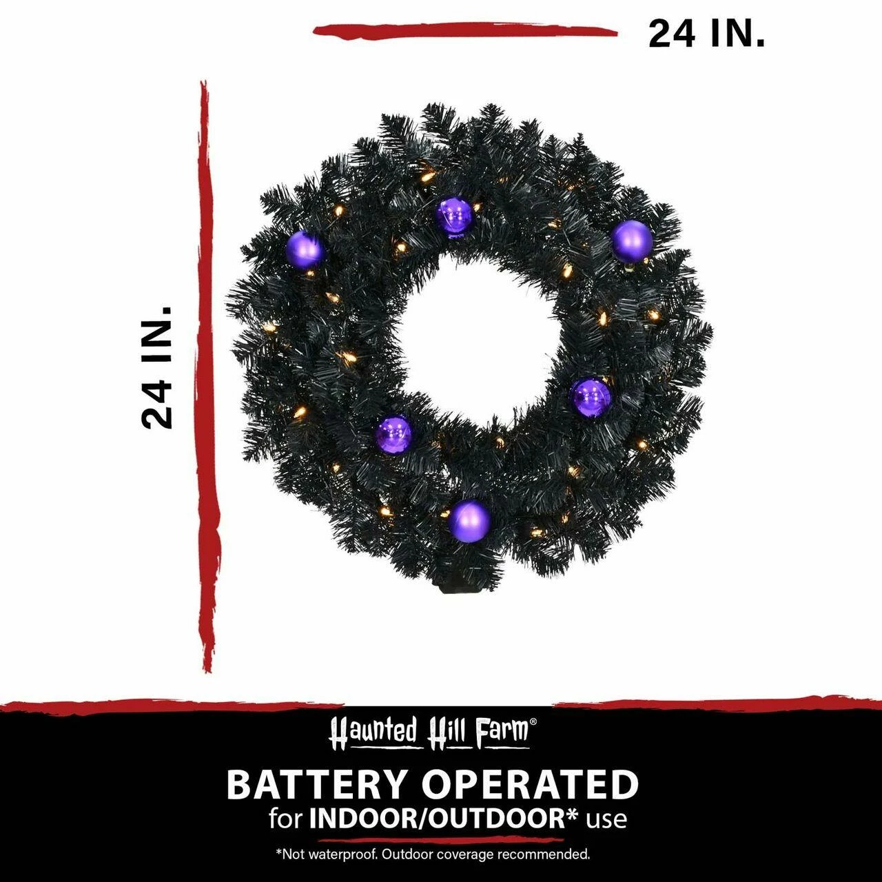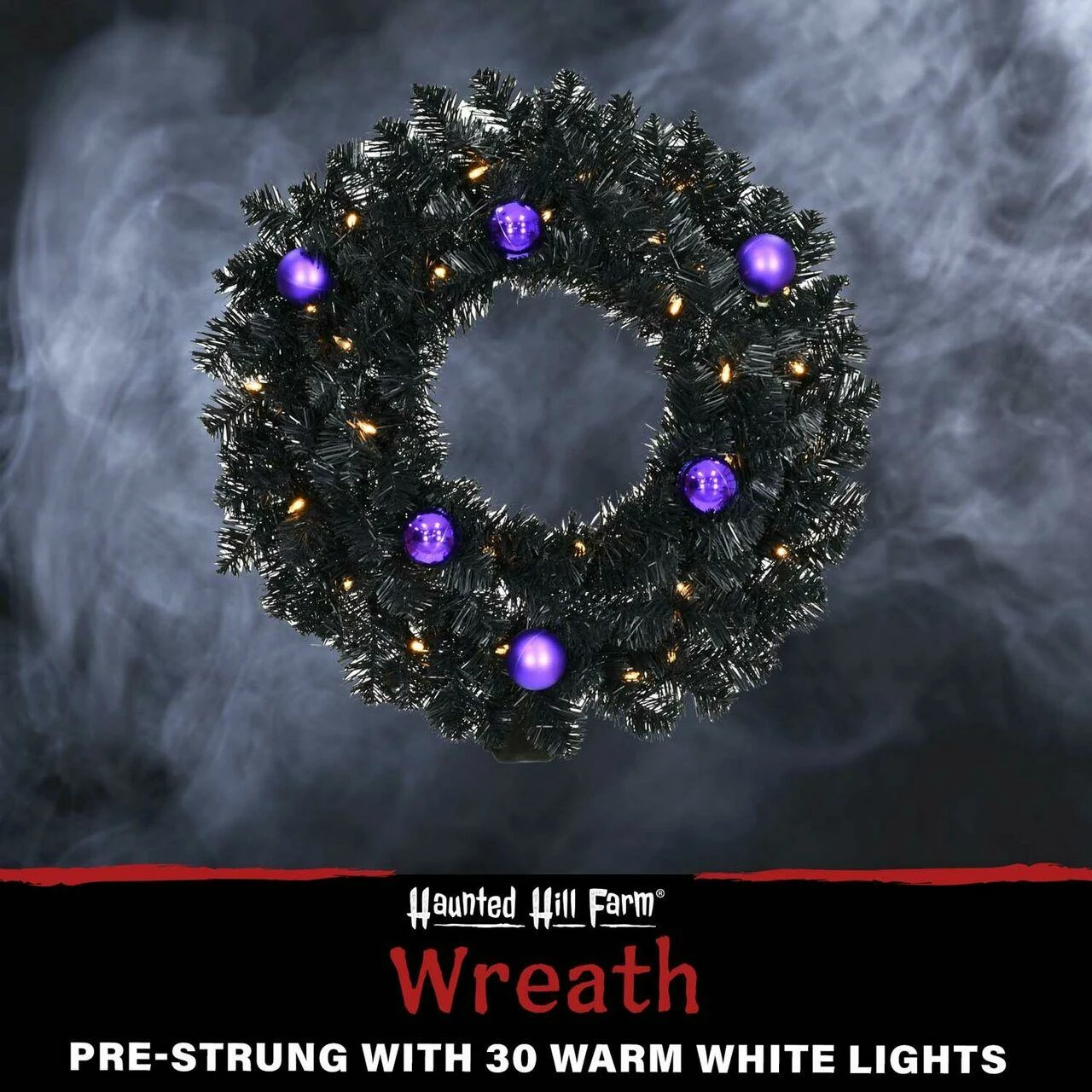 Add a little extra spook to your Halloween with this haunted 24-in. black tinsel wreath from Haunted Hill Farm. This ghostly wreath will make an eerie statement in any room it’s placed in from the moment you unbox it. Black tinsel needles populate each branch and reflect light from every angle. Warm white LED lights are evenly distributed throughout the wreath and provide extra light to the frightening display. Metal-hinged branches make it easy to unfold each tier and begin fluffing. These metal branches are extra-durable and designed for many years of bending and folding in and out of storage. There are purple metal ornaments that are durable and provide that extra spook for years to come. This wreath can excellently fit on your porch, in your haunted house, or yard. Our Haunted Hill Farm tinsel wreath is the final nail in the coffin for your decor this Halloween!