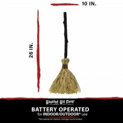 - 26-inch battery-operated witch’s broomstick with sound and movement