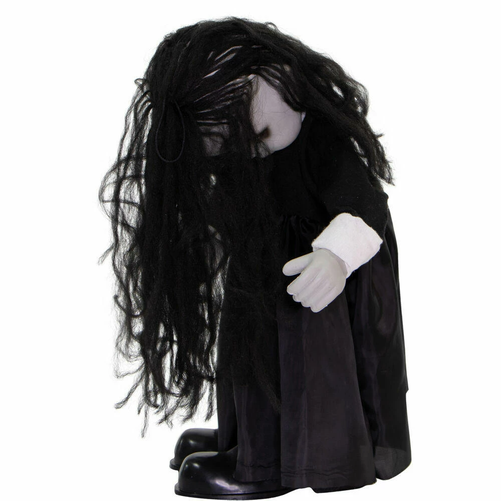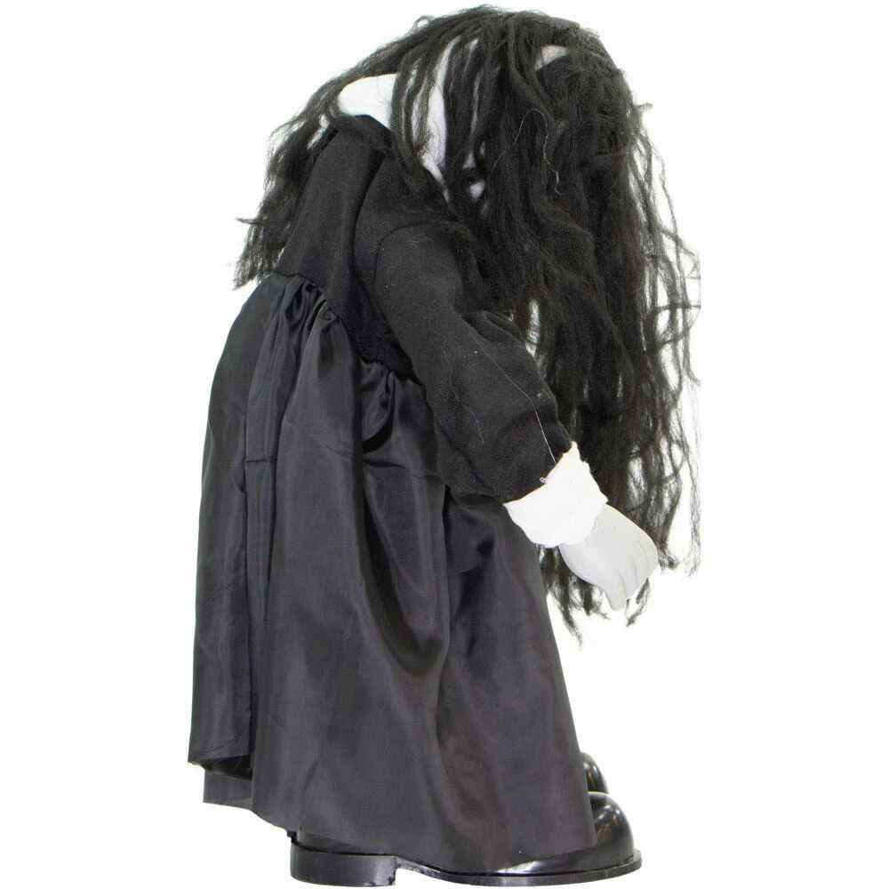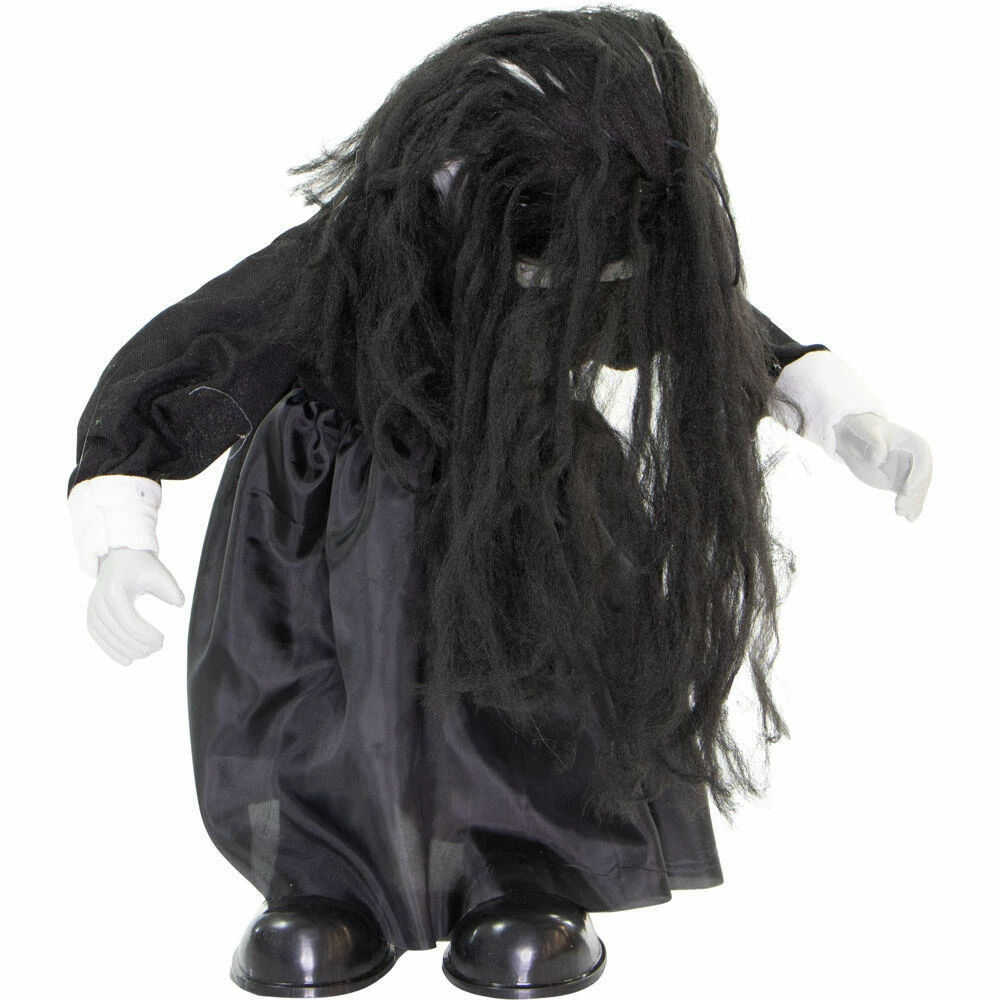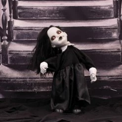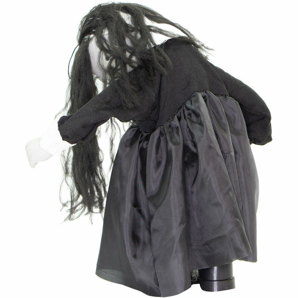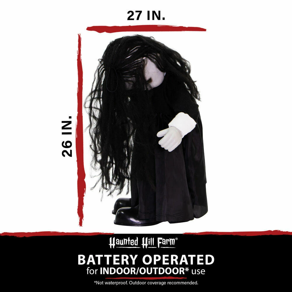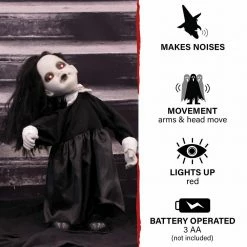 Be afraid! Be very afraid of the Lawn of the Dead Collection from Haunted Hill Farm. Our blood-curdling zombies are just what you need to turn your home into the scariest house on the block. Lana, the growling zombie girl, just wants to be your friend. Umm, maybe not! There is a rumor that she loves the taste of fingertips just as much as brains. Bump activated, Lana features animated head and arm movements along with ghastly growling and ghostly laughter while her eyes flicker red. Battery operated with posable arms, she includes a stand and an optional hanging loop at the top of her head so you can display her however you want. Her stand arrives compressed, but a simple pull of the legs will extend them to their full length. Bring Lana home with you this Halloween to join your hoard of undead zombies and enjoy the creeps she will give your guests.