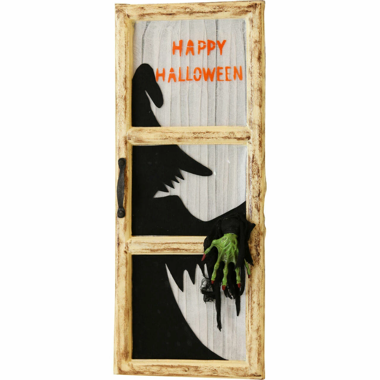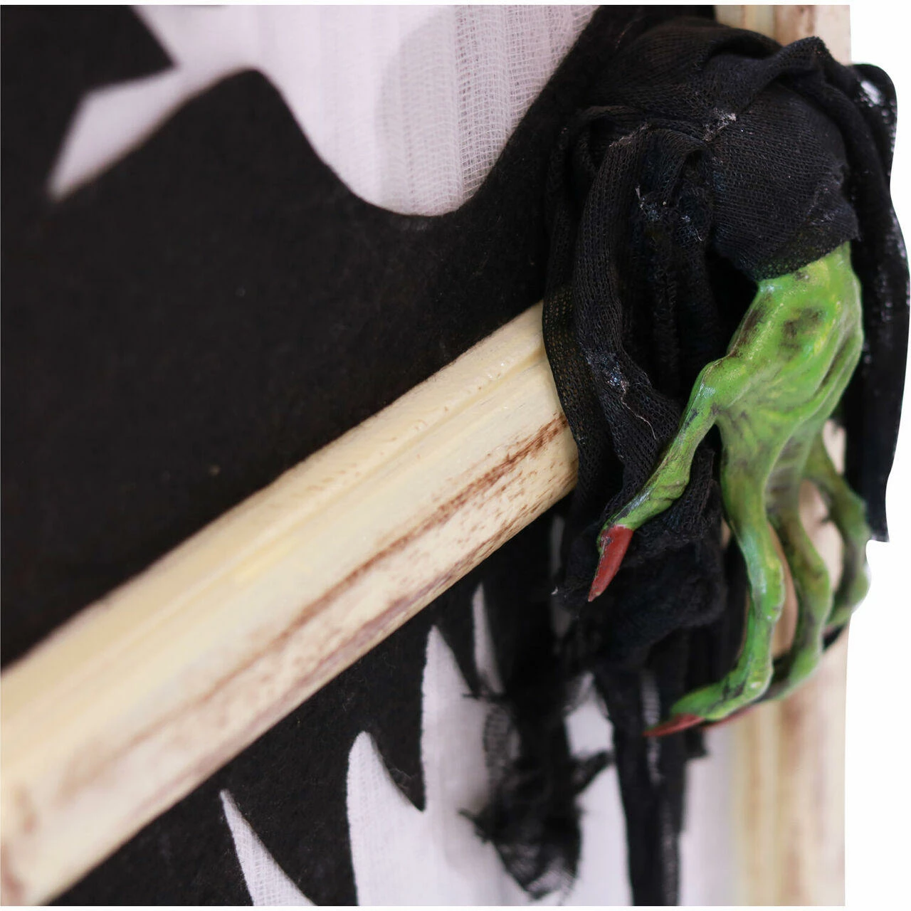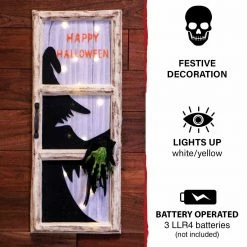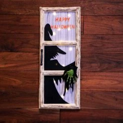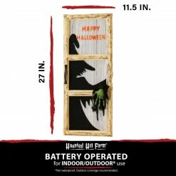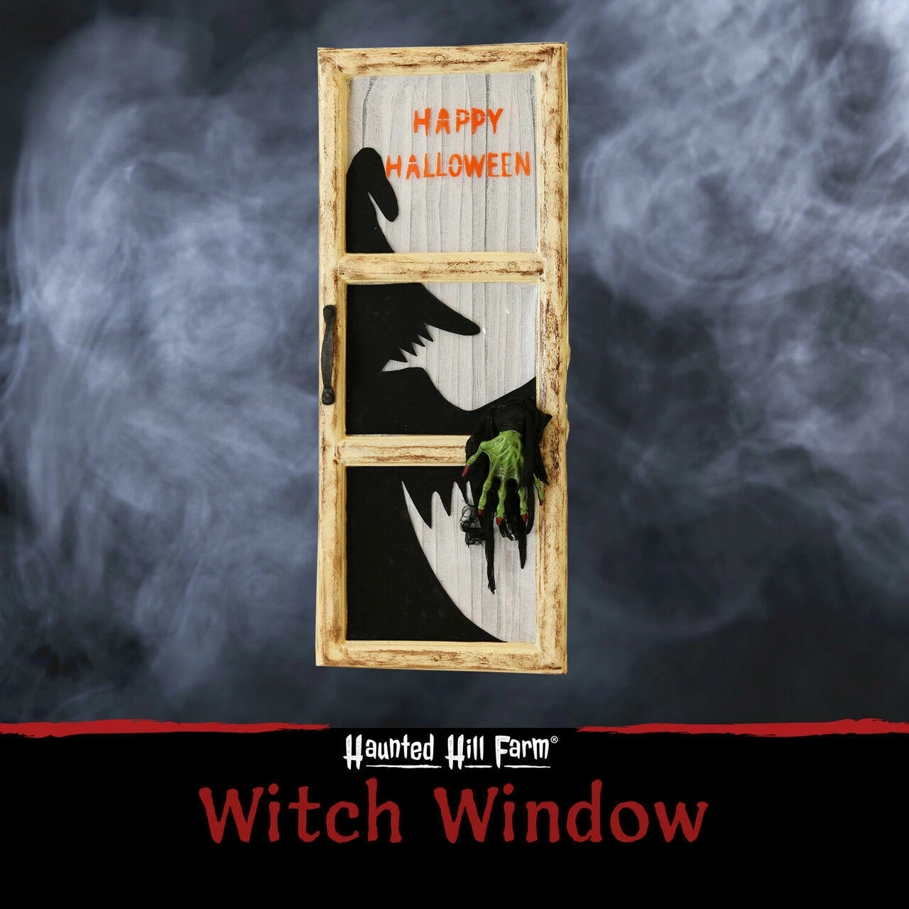 Be afraid! Be very afraid of Haunted Hill Farm’s Lawn of the Dead Collection. Greet visitors in a frighteningly festive way this Halloween with this evil witch in her very own light-up window. Place it on your window ledge or in your haunted house to give guests a double-take. The evil witch’s gnarly green hand, complete with long red fingernails, protrudes from the window interior as though she is reaching for victims. HAPPY HALLOWEEN sits above the dark witch outline in slanted orange letters. White lights illuminate the display, ensuring your home stands out on the block. At Haunted Hill Farm, our Halloween props are sure to delight any trick-or-treaters, co-workers, or customers.