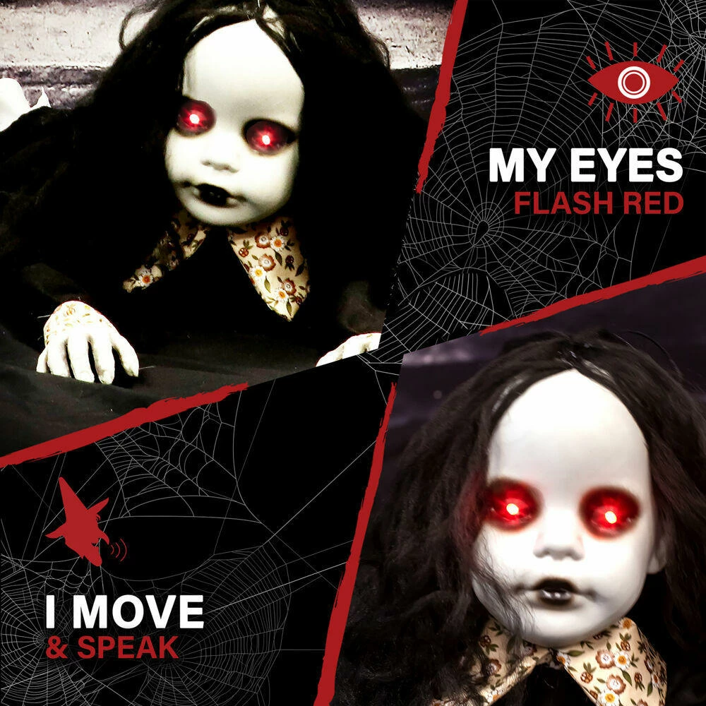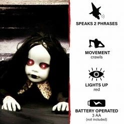 - Bump-activated creature speaks 2 phrases with animated crawling movements and red flashing eyes