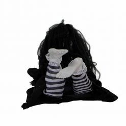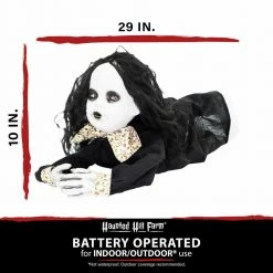 Be afraid! Be very afraid of the Lawn of the Dead Collection from Haunted Hill Farm. Our blood-curdling zombies are just what you need to turn your home into the scariest house on the block. Creepy Dawn, the crawling zombie girl, is known to lure her victims in with her desperate cry for help and piercing scream. Once someone gets close to help her, she attacks, gnawing off their fingertips and nose, leaving their brain for last. Bump activated, Creepy Dawn has an animated crawling-like motion and speaks two phrases. Her eyes flash crimson red, signaling her thirst for blood. She is battery-operated with posable arms and legs. Bring Creepy Dawn home this Halloween to join your hoard of undead zombies and enjoy the creeps she will give your guests.
