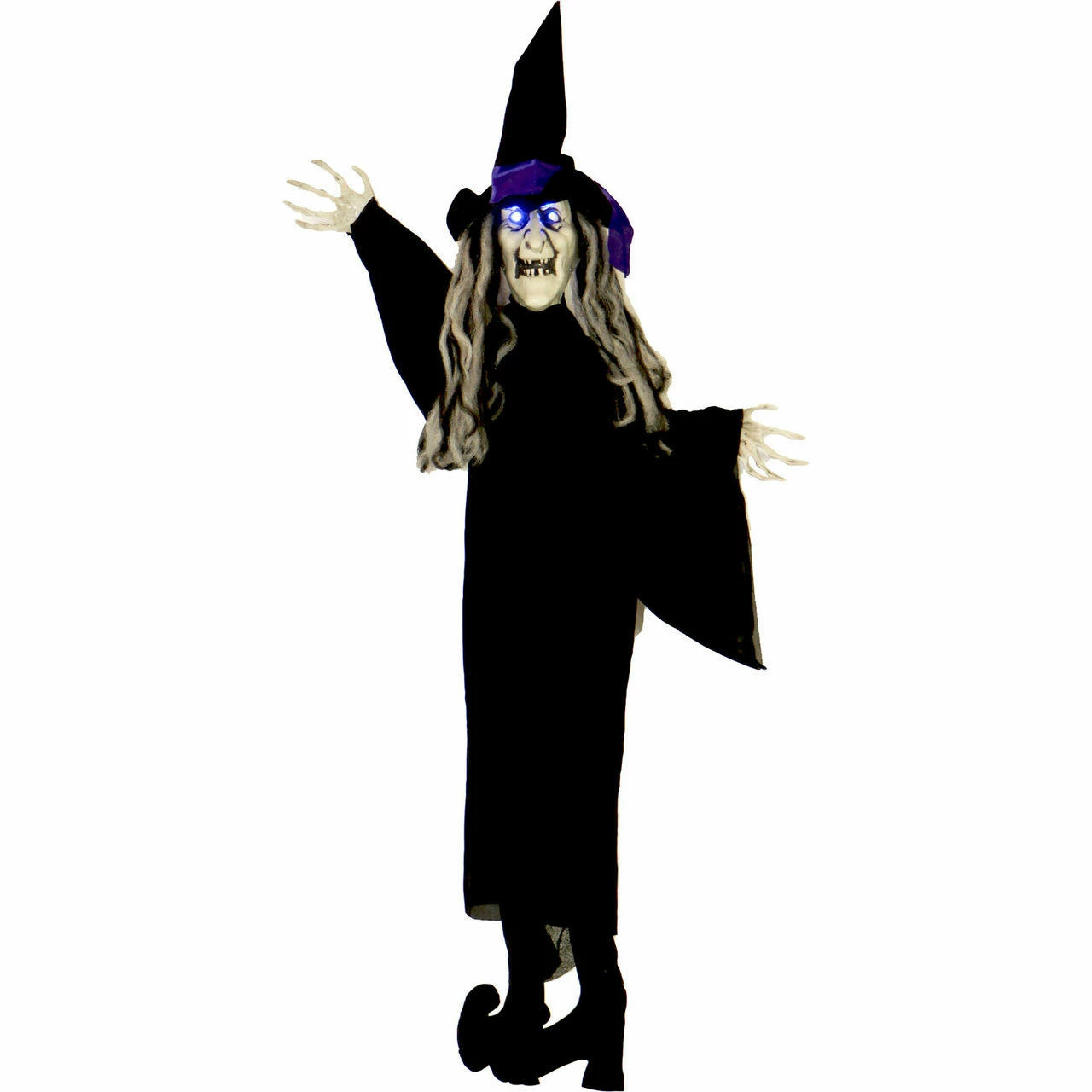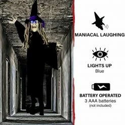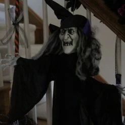 Be afraid! Be very afraid of Haunted Hill Farm’s Curses and Cauldrons Collection. These blood-curdling creatures are sure to terrify any trick-or-treaters, co-workers, or customers. Our floating witch will scare children and adults alike with her haggish face and bony fingers. When touched, she comes alive, seemingly floating up and down from the ceiling with crazy laughter, eerie music, and creepy background noises. She is exactly what you’d picture when thinking of a spooky witch and manages to be even more unsettling in person.