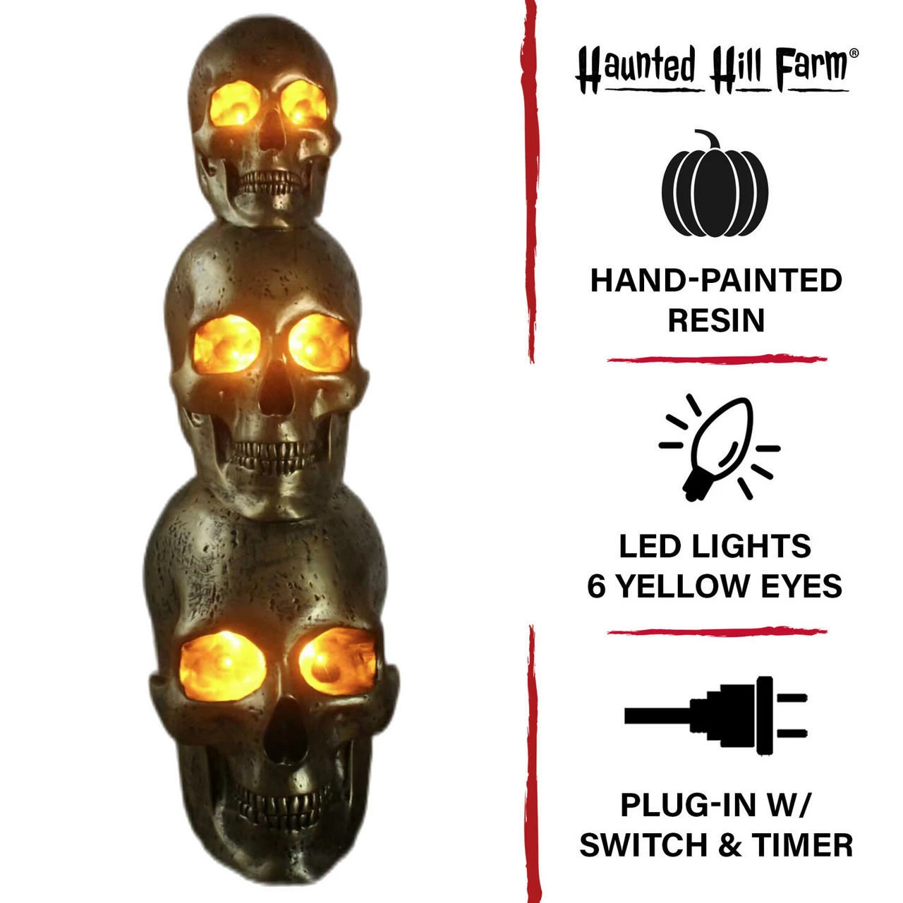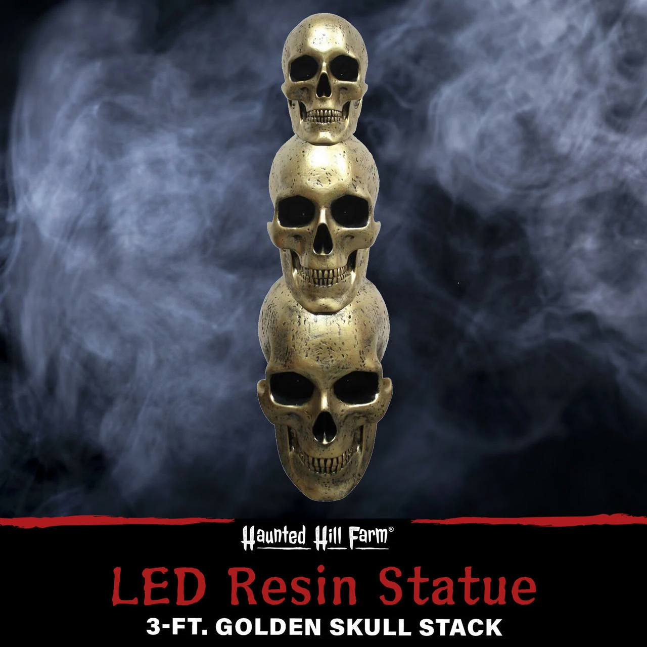Add a little creepiness to your holiday decor with our Resin Halloween Decorations by Haunted Hill Farm. Our Golden Skull Stack resin statue stands 3 feet tall – perfect for a graveyard scene or haunted house display that everyone will love. LED lights cast an eerie glow to set a frightful mood and delight your trick-or-treaters. Place it indoors or under a covered area outdoors. Buy two to flank a door or a wide stairway. Use alone or combine with our large variety of seasonal props to create a spooktacular display. Count on quality products from Haunted Hill Farm for lots of spooky fun this Halloween season.