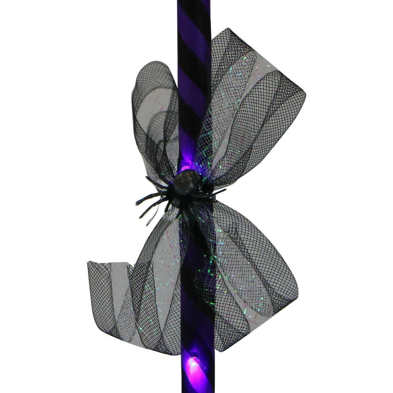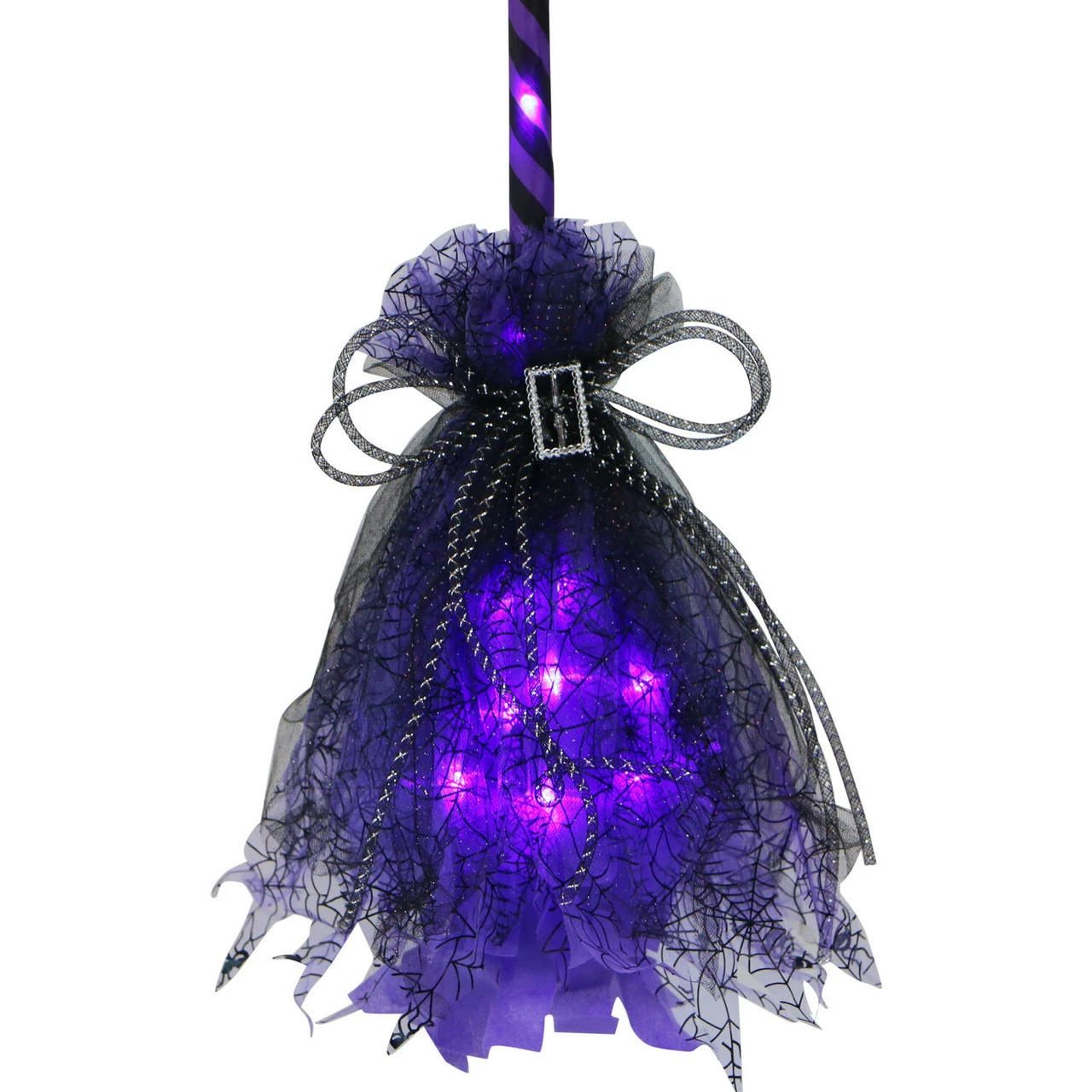 - Purple tulle broom covered in LED lights and black spider web print faux lace topped with a witches buckle
